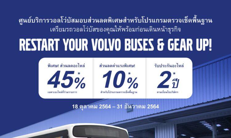 บริษัท วอลโว่ บัส (ประเทศไทย) จำกัด ซึ่งเป็นผลิตและจัดจำหน่ายรถบัสสายพันธุ์สวีเดน วอลโว่ บัส อย่างเป็นทางการในประเทศไทย เชิญชวนลูกค้านำรถวอลโว่ บัส เข้ารับการตรวจเช็คใหญ่เพื่อรับกับนโยบายการเปิดประเทศต้อนรับนักท่องเที่ยวของรัฐบาล โดยจัดโปรโมชันพิเศษสำหรับการเข้าเช็คใหญ่ ภายใต้แคมเปญ “Restart Your Volvo Buses and Gear Up” โดยลดค่าอะไหล่ที่ร่วมรายการ 45%
