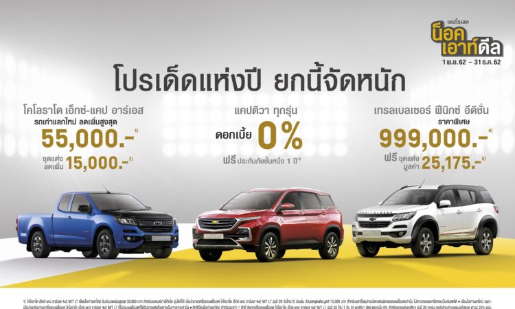เชฟโรเลต ประเทศไทย นำเสนอ “เชฟโรเลต น็อค เอ้าท์ ดีล”* โปรโมชั่นเด็ดส่งท้ายปี เพื่อให้ลูกค้าเป็นเจ้าของรถเชฟโรเลตทุกรุ่นได้ง่ายยิ่งขึ้น ทั้งอัตราดอกเบี้ย 0 เปอร์เซ็นต์สำหรับรถอเนกประสงค์ แคปติวา ใหม่ ทุกรุ่น ข้อเสนอพิเศษพร้อมฟรีชุดแต่งรอบคันสำหรับรถอเนกประสงค์ เทรลเบลเซอร์ และแคมเปญนำรถเก่าแลกซื้อรถใหม่รับส่วนลดเพิ่มเติมสูงสุด 85,000 บาท สำหรับรถกระบะ โคโลราโด ซึ่งเป็นข้อเสนอเดียวกับงานมอเตอร์เอ็กซ์โป 2019