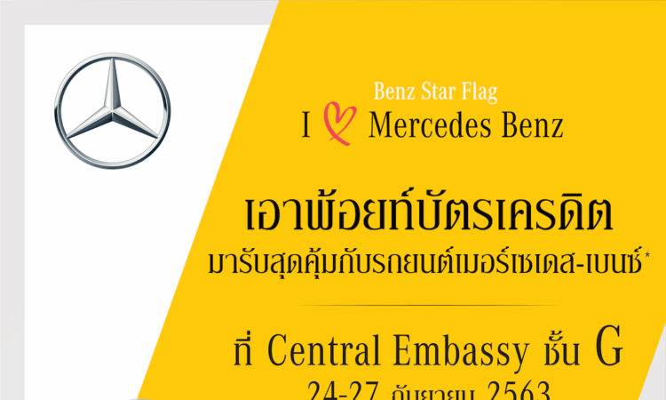 บริษัท สตาร์แฟลก จำกัด ผู้แทนจำหน่ายรถยนต์เมอร์เซเดส-เบนซ์อย่างเป็นทางการต่อยอดความสำเร็จและเสียงตอบรับ จากแคมเปญที่ผ่านมา สู่การจัดงานเปิดตัวแคมเปญยิ่งใหญ่ให้สิทธิประโยชน์ที่มากกว่า ใน “I Love Mercedes-Benz at Central Embassy”ที่ครั้งนี้พิเศษสุดๆกับโปรโมชั่นสะเทือนวงการ เอาพ้อยท์บัตรเครดิตมารับสุดคุ้มกับรถยนต์ เมอร์เซเดส-เบนซ์(*เงื่อนไขเป็นไปตามที่บริษัทฯกำหนด)ไม่ว่าจะมีพอยท์เยอะ พอยท์เหลือ หรือจะใช้แลกรับบริการที่ศูนย์บริการหลังการขาย ศูนย์ซ่อมสีและตัวถัง อีกทั้งยังใช้พอยท์บัตรเครดิตของท่านมาเป็นส่วนลดไว้เลือกช้อปกับมุม Benz Star Flag Accessory Collection ได้อีก ในวันที่ 24-27 กันยายน 2563นี้เท่านั้น ณ ศูนย์การค้า เซ็นทรัล เอ็มบาสซี ชั้น Gห้ามพลาด!