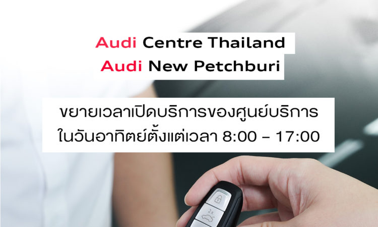 ในส่วนของวันให้บริการจะมีการขยายเพิ่มการบริการในวันอาทิตย์ (ยกเว้นวันหยุดนักขัตฤกษ์)พร้อมขยายเวลาเปิดบริการของศูนย์บริการในวันอาทิตย์ตั้งแต่เวลา 8:00 – 17:00 โดยจะเริ่มเปิดให้บริการวันอาทิตย์ที่ 21 กุมภาพันธ์ 2564ที่ Audi Centre Thailand สาขาเลียบด่วนเอกมัยรามอินทราและ Audi สาขาถนนเพชรบุรีตัดใหม่ เพื่ออำนวยความสะดวกและตอบโจทย์ไลฟ์สไตล์ของลูกค้า และเพื่อความรวดเร็วในการบริการ อันเป็นปัจจัยสำคัญที่สร้างความพึงพอใจให้ลูกค้า