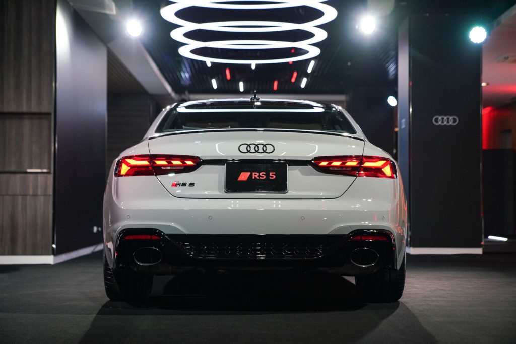 “RS 5 Coupé quattro” ถูกเสริมให้มีความสปอร์ตยิ่งขึ้น ด้วยโลโก้หน้า-หลังสีดำ สปอยเลอร์ท้ายรถ Ducktail พร้อมทั้งกระจกมองข้าง รวมถึงกระจกหน้าต่างล้วนเป็นสีดำ ท่อไอเสียแบบ RS สปอร์ตขอบข้างแผ่นดิฟฟิวเซอร์ที่ส่วนท้ายซึ่งล้อมรอบท่อไอเสียขนาดใหญ่สองท่อถูกปรับดีไซน์ใหม่ สีดำเงา หลังคาพาโนรามิคขนาดใหญ่ และตกแต่งหลังคาด้านนอกด้วยสีดำ Mythos black metallic บริเวณส่วนท้ายของหลังคาจรดกระจกบังลมด้านหลังช่วงล่างจัดเต็มด้วยการปรับจูนแบบ RS สปอร์ต เพื่อการขับขี่ไดนามิก