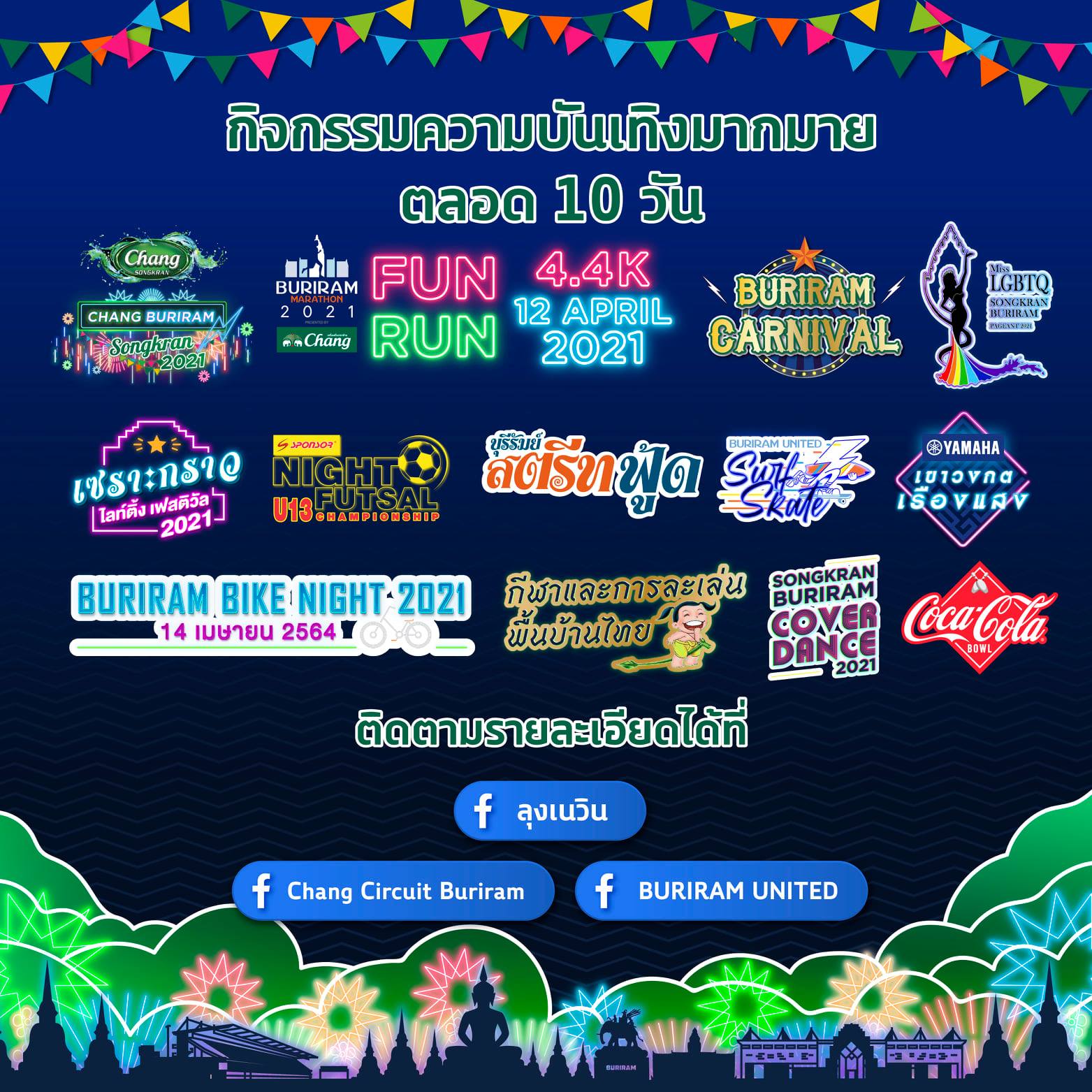 14 เมษายน 2564 คอนเสิร์ตแบบเว้นระยะห่าง Chang Music Connection รับชมในสนามฟุตบอลช้างอารีน่า กับศิลปินเบอร์หนึ่งของเมืองไทย “ปาล์มมี่” / ประกวดเต้น Cover Dance 2021 / การแข่งขันฟุตซอล “สปอนเซอร์ U13 ไนท์ ฟุตซอล แชมเปี้ยนชิพ รอบชิงชนะเลิศ / บุรีรัมย์ ไบค์ ไนท์ 2021