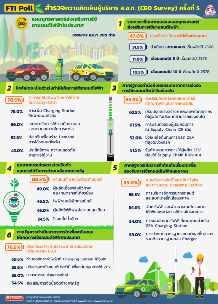 จากการสำรวจผู้บริหาร ส.อ.ท. (CEO Survey) จำนวน 200 ท่าน ครอบคลุมผู้บริหารจาก45 กลุ่มอุตสาหกรรม และ 75 สภาอุตสาหกรรมจังหวัด พบว่า ผู้บริหาร ส.อ.ท. ส่วนใหญ่ต้องการให้ภาครัฐเริ่มดำเนินการแผนยุทธศาสตร์ส่งเสริมการใช้ยานยนต์ไฟฟ้าในประเทศให้เร็วขึ้นเพื่อให้บรรลุเป้าหมายก่อนกำหนดในปี 2568 คิดเป็น 47.0 % รองลงมาเห็นด้วยตามกรอบระยะเวลาตามแผนฯ ที่จะเริ่มการใช้รถยนต์ไฟฟ้าในปี 2568 คิดเป็น 31.5% และมีเสนอให้เลื่อนการดำเนินงานตามแผนฯ ออกไป 5 ปี และ 10 ปี คิดเป็น 11% และ 10.5% ตามลำดับ