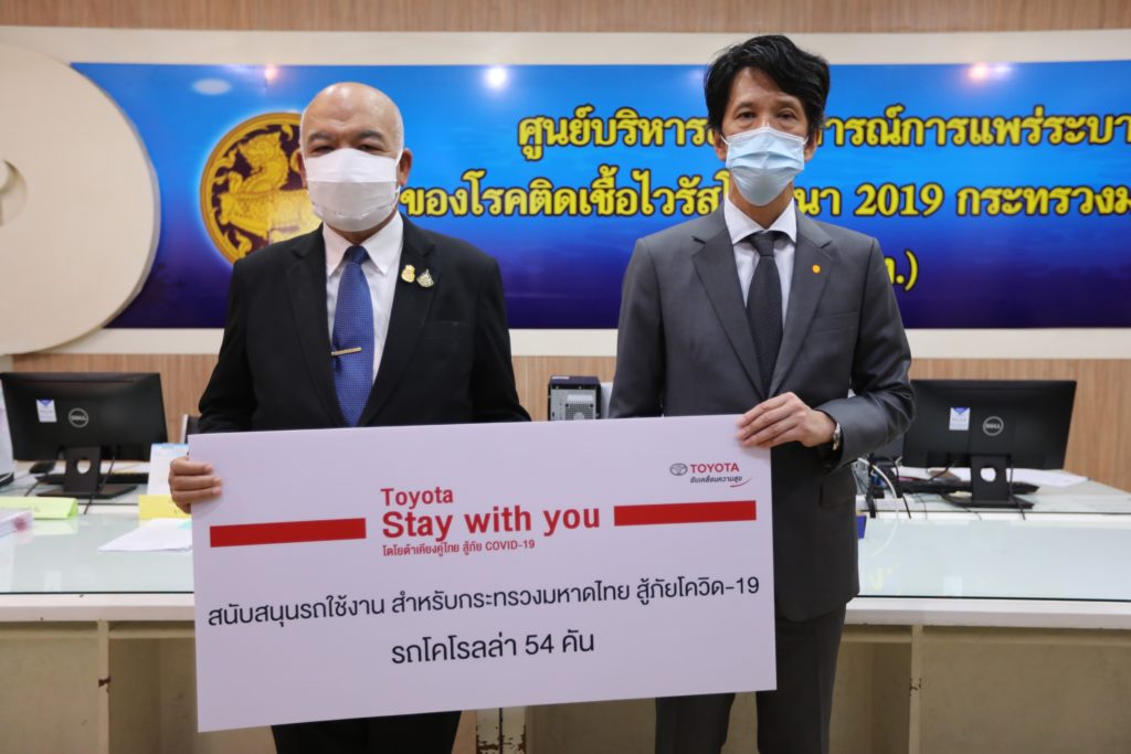 นายโนริอากิ ยามาชิตะ กรรมการผู้จัดการใหญ่ บริษัท โตโยต้า มอเตอร์ ประเทศไทย จำกัด พร้อมด้วยคณะผู้บริหารบริษัทฯ ในฐานะตัวแทนเครือข่ายโตโยต้าทั่วประเทศ ร่วมพิธีส่งมอบรถยนต์โตโยต้า โคโรลล่า (พร้อมประกันภัยประเภท 1 และ พรบ.ผู้ประสบภัยจากรถ) จำนวน 54 คันให้กับกระทรวงมหาดไทย โดยมีนายฉัตรชัย พรหมเลิศ ปลัดกระทรวงมหาดไทย ร่วมเป็นเกียรติในพิธีฯ และได้ทำการส่งมอบรถยนต์โตโยต้า คัมรี จำนวน 22 คัน โตโยต้า ฟอร์จูนเนอร์ จำนวน 2 คัน และไฮลักซ์ รีโว่ จำนวน 2 คัน รวม 26 คัน ให้กับกรุงเทพมหานคร โดยมีพลตำรวจเอก อัศวิน ขวัญเมือง ผู้ว่าราชการกรุงเทพมหานคร ร่วมเป็นเกียรติในพิธีฯ เพื่อใช้ในการปฏิบัติภารกิจของเจ้าหน้าที่ในการแก้ไขสถานการณ์การแพร่ระบาดของเชื้อไวรัส COVID-19 ภายใต้โครงการ “โตโยต้าเคียงคู่ไทย สู้ภัย COVID-19” หรือ ” Toyota Stay With You” เมื่อวันที่ 20 พฤษภาคม 2564 ที่ผ่านมา ณ กระทรวงมหาดไทย และศาลาว่าการกรุงเทพฯ