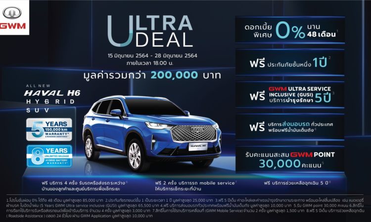 จัดเต็มเซอร์ไพรส์เพื่อลูกค้ากลุ่มแรกของแบรนด์ เกรท วอลล์ มอเตอร์ สร้างปรากฏการณ์ใหม่อีกครั้งให้กับอุตสาหกรรมยานยนต์ไทย เปิดข้อเสนอสุดพิเศษผ่าน “ULTRA DEAL Campaign” สำหรับลูกค้ากลุ่มแรก ในการจองสิทธิ์ลงทะเบียนเพื่อซื้อ All New HAVAL H6 Hybrid SUV โดยไม่มีค่าใช้จ่ายใดๆ พร้อมมอบข้อเสนอสุดพิเศษก่อนการประกาศราคาอย่างเป็นทางการ ผ่านช่องทาง GWM Application และเว็บไซต์ WWW.GWM.CO.TH ในระหว่างวันที่ 15 มิถุนายน 2564 – 28 มิถุนายน 2564 นี้เท่านั้น จัดเต็มทั้งแพ็กเกจ 5 Years GWM ULTRA INCLUSIVE SERVICE ดอกเบี้ย 0% นาน 48 เดือน พร้อมประกันภัยรถยนต์ชั้น 1 และบริการส่งมอบรถยนต์ถึงหน้าบ้าน รวมถึงเอกสิทธิ์เหนือระดับอื่นๆ อีกมากมาย