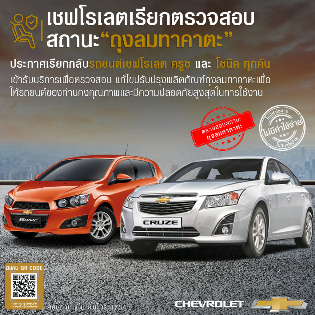 เชฟโรเลต ประเทศไทย ยังคงสานต่อคำมั่นด้านบริการหลังการขายให้กับผู้ใช้รถยนต์เชฟโรเลตในไทยเพื่อให้รถยนต์ของท่านคงคุณภาพและมีความปลอดภัยอย่างสูงสุดในการใช้งาน บริษัทขอให้ท่านเจ้าของรถยนต์เชฟโรเลต ครูซ ระหว่างรุ่นปี 2011 ถึงรุ่นปี 2015 และรถยนต์เชฟโรเลต โซนิค รุ่นปี 2013 และรุ่นปี 2014 นำรถยนต์รุ่นปีดังกล่าวเข้ามารับการเปลี่ยนถุงลมนิรภัยทาคาตะ ตามที่เชฟโรเลต ประเทศไทย เคยประกาศเรียกกลับเพื่อตรวจสอบรถยนต์ทั้งสองรุ่นเมื่อวันที่ 12 เมษายน พ.ศ. 2562 เป็นต้นมา