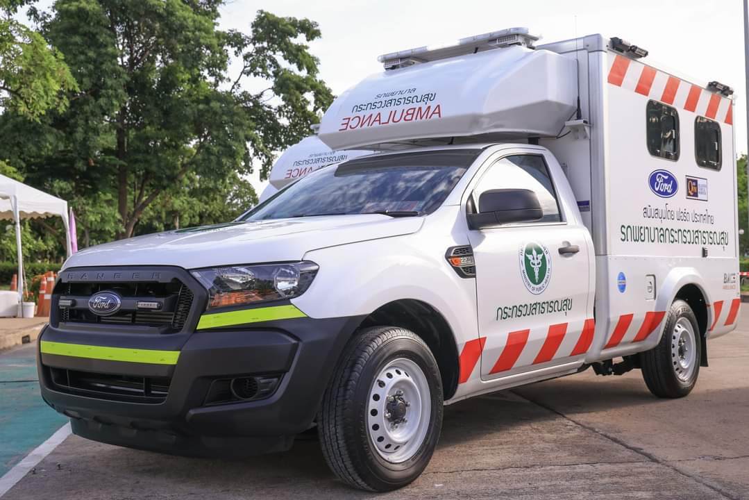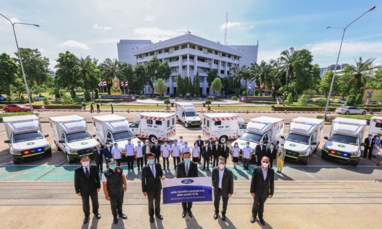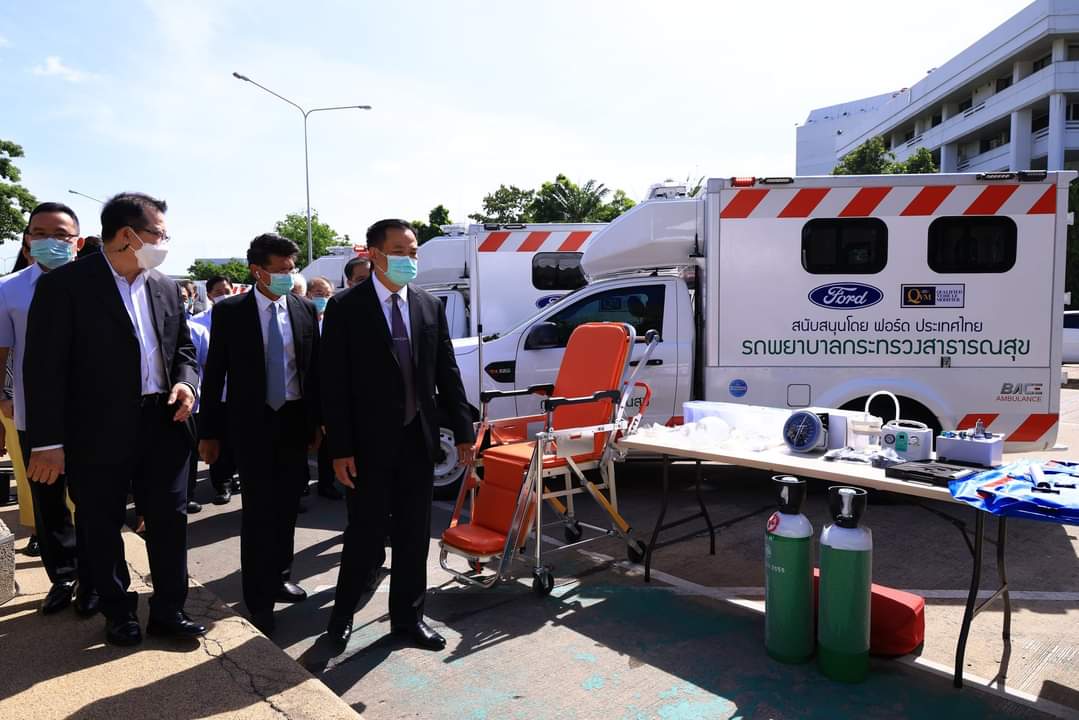 นายอนุทิน ชาญวีรกูล รองนายกรัฐมนตรีและรัฐมนตรีว่าการกระทรวงสาธารณสุข ดร. สาธิต ปิตุเตชะ รัฐมนตรีช่วยว่าการกระทรวงสาธารณสุข นายแพทย์เกียรติภูมิ วงศ์รจิต ปลัดกระทรวงสาธารณสุข และนายสมศักดิ์ พะเนียงทอง คณะที่ปรึกษารัฐมนตรีช่วยว่าการกระทรวงสาธารณสุข (ซ้ายสุด) รับมอบรถพยาบาลบริการการแพทย์ฉุกเฉิน BACE รุ่น RESCUE T1 พร้อมอุปกรณ์การแพทย์ครบครันจำนวน 10 คัน มูลค่ากว่า 12 ล้านบาท จากฟอร์ด ประเทศไทย โดยมี นายวิชิต ว่องวัฒนาการ กรรมการผู้จัดการ ฟอร์ด ประเทศไทย (ที่ 5 จากซ้าย) และนายจักริศวร์ โลจนะโกสินทร์ ผู้จัดการทั่วไป บริษัท เอส.เอส.เอส. ออโตโมทีฟ อินดัสทรี จำกัด (ขวาสุด) เพื่อสนับสนุนการปฏิบัติงานทางการแพทย์ของกระทรวงสาธารณสุขในสถานการณ์การแพร่ระบาดของโรคโควิด-19 และเพื่อใช้งานตามวัตถุประสงค์อื่นที่จำเป็นหรือเป็นประโยชน์ต่อสังคม