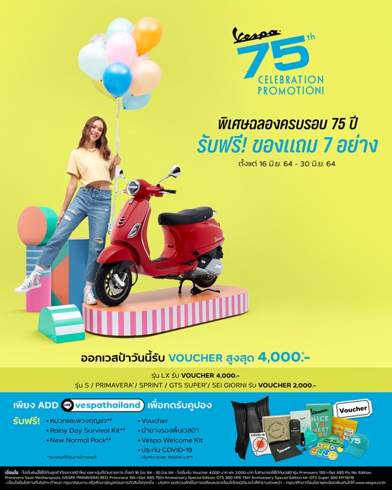 - เมื่อออกเวสป้าใหม่วันนี้ รับ Voucher สูงสุดถึง 4,000 บาท พร้อมรับของแถมฟรีอีกมากมาย