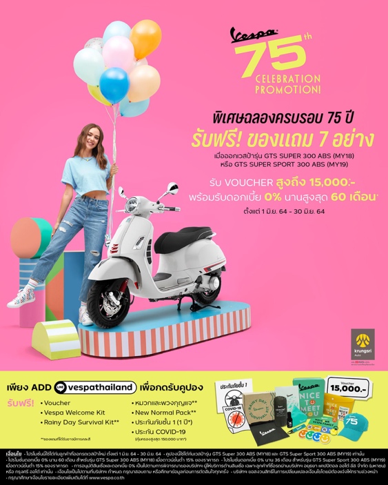 พร้อมเตรียมมอบอีกหนึ่งความพิเศษเพื่อแฟนๆ เวสป้า ขนขบวนโปรโมชั่นพิเศษฉลองครบรอบ75 ปี มอบความพิเศษสุดเอ็กซ์คลูซีฟด้วยของสมมนาคุณและพรีเมี่ยมมากมาย