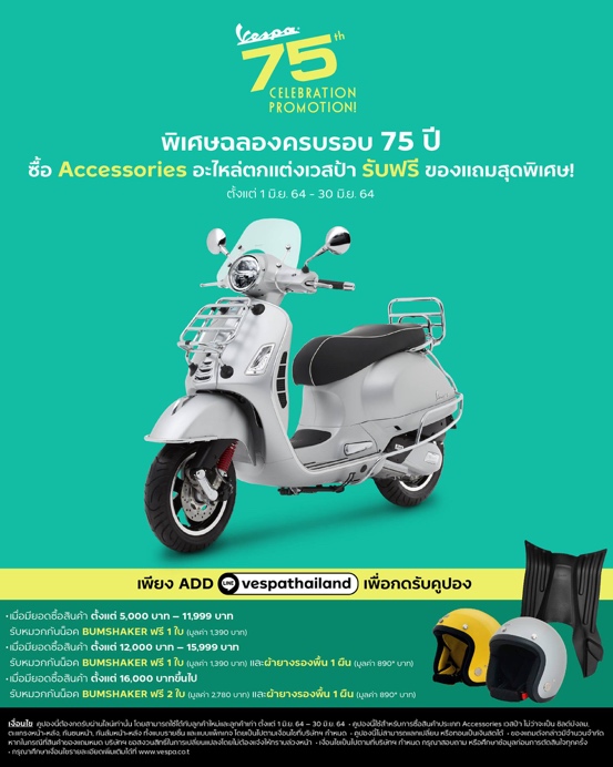 - โปรโมชั่นเอาใจคนชอบแต่งเวสป้า! ซื้อ Accessories หรืออะไหล่ตกแต่งรถเวสป้าทุกรุ่นตามยอดที่กำหนดวันนี้