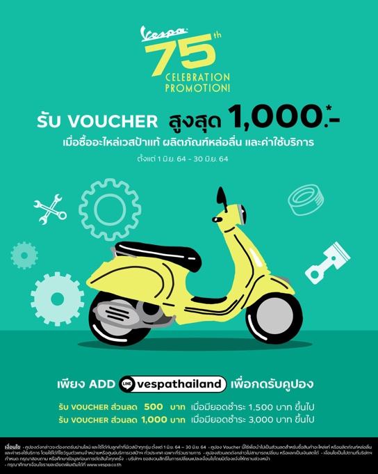 - เวสป้ามอบ VOUCHER ส่วนลดสูงสุด 1,000 บาทสำหรับลูกค้าปัจจุบัน