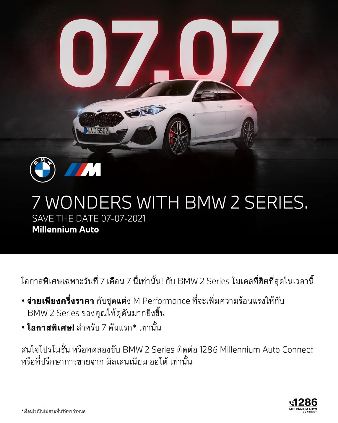 มิลเลนเนียม ออโต้ เปิดโอกาสให้จับจองรถรุ่นพิเศษ กับโปรโมชั่น ‘7 Wonders with BMW2 Series’ ภายใต้รหัส ‘07.07’ ในวันที่ 7 กรกฎาคม กับบีเอ็มดับเบิลยู 220i Gran Coupé Sport ที่มาพร้อมชุดแต่ง M Sport 7 ชิ้น และคุ้มค่าเหนือใคร เพราะจ่ายค่าชุดแต่งแค่ครึ่งเดียว สำหรับลูกค้าที่ซื้อเป็น 7 คันแรก สมทบด้วย บีเอ็มดับเบิลยู X1 sDrive20d M Sport (LCI) ที่มาพร้อมแคมเปญแรงแบบไม่เคยมีมาก่อน โดยมอบ BSI นานถึง 10 ปี หรือ 100,000 กม. ให้กับผู้ที่จองและออกรถภายในเดือนกรกฎาคม นอกจากนั้นก็มียนตรกรรมยอดนิยมหลากรุ่น อาทิ, X3 xDrive30e M Sport, 320d M Sport, 430i Coupé M Sport และ 520d M Sport(M Performance Edition) พร้อมเลือกรับ 1 จาก 5 ข้อเสนอพิเศษที่ตรงใจมากสุ