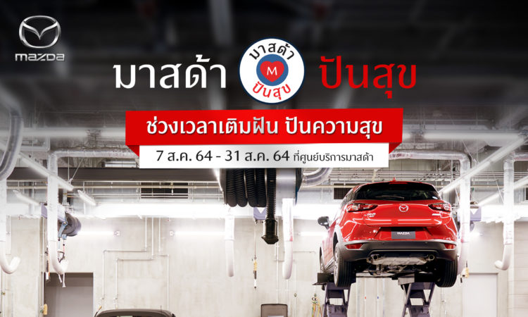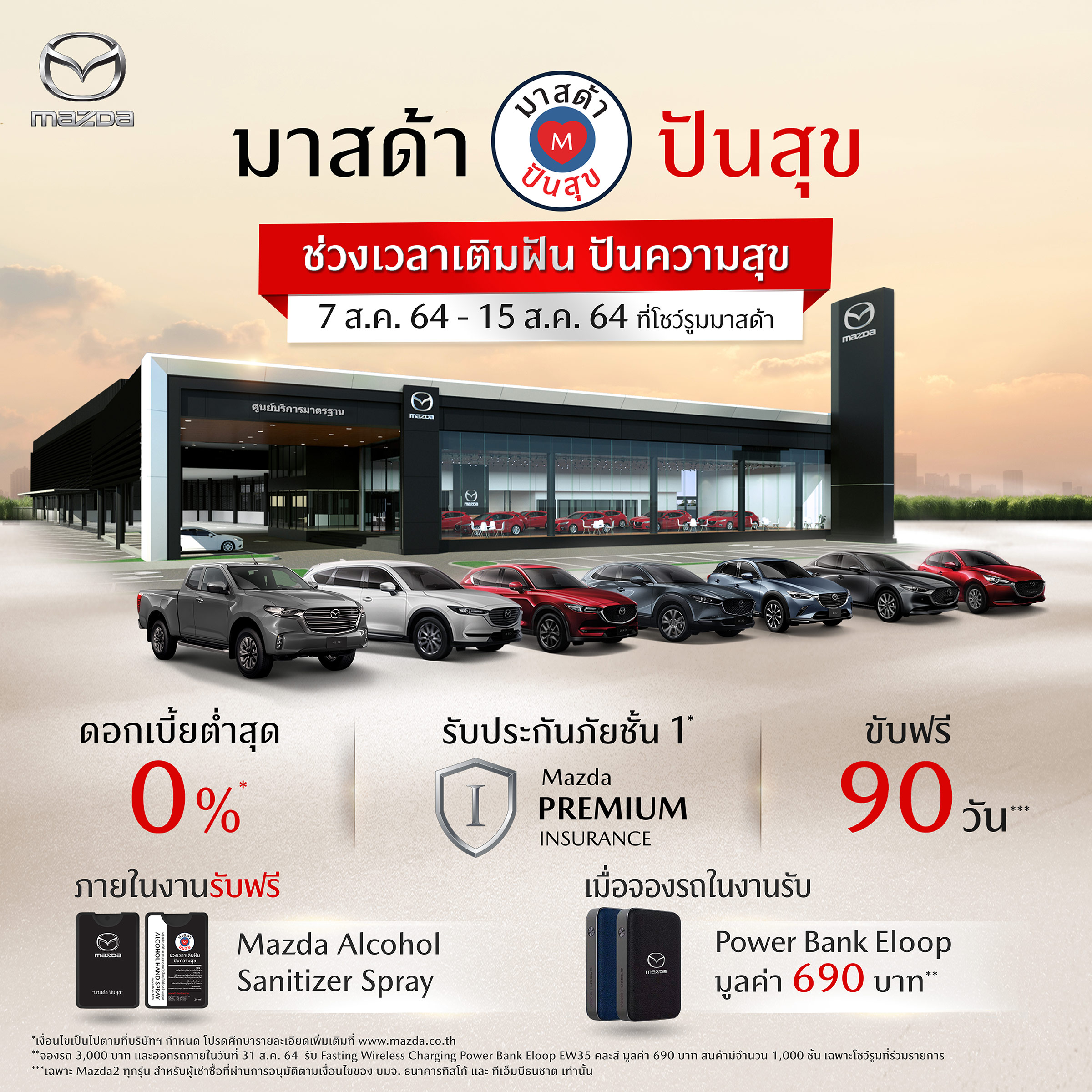 มาสด้าสานฝันลูกค้าที่ต้องการออกรถใหม่ในเดือนสิงหาคมกับโครงการ “มาสด้า ปันสุข” ช่วงเวลาเติมฝัน ปันความสุข เพื่อส่งมอบความสุขให้กับลูกค้าที่สนใจรถยนต์มาสด้า รวมทั้งมอบสิทธิพิเศษมากมายสำหรับลูกค้าปัจจุบัน ด้วยข้อเสนอสุดพิเศษดอกเบี้ยต่ำสุด 0%1 ฟรีประกันภัยชั้น 1 Mazda Premium Insurance1 ขับฟรี 90 วัน2 และฟรี Fast Wireless Charging Power Bank Eloop EW353 โดยจัดกิจกรรมขึ้นในระหว่างวันที่ 7 – 15 สิงหาคม 2564 ที่โชว์รูมมาสด้าทั่วประเทศ รวมถึงมอบสิทธิพิเศษเพื่อช่วยดูแลรถยนต์ของลูกค้าและช่วยแบ่งเบาภาระค่าใช้จ่ายในช่วงนี้ เมื่อนำรถเข้ารับบริการรับข้อเสนอสุดพิเศษ อาทิ ผ่อนชำระสบายๆ 0% นานสูงสุด 10 เดือน1 สำหรับสินค้าและบริการหลังการขายในศูนย์บริการฯ ตรวจสภาพรถฟรี 20 รายการ1 ฟรีบริการฉีดพ่นน้ำยาฆ่าเชื้อภายในรถยนต์1 และส่วนลดค่าแรง 50%4 ในระหว่างวันที่ 7 – 31 สิงหาคม 2564