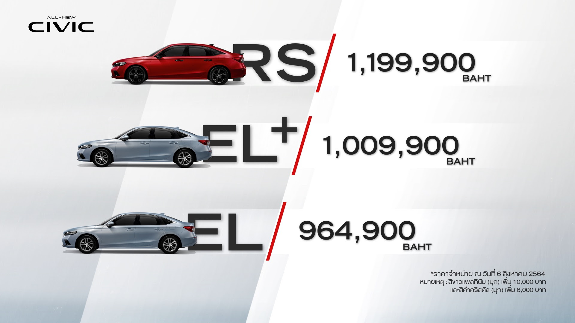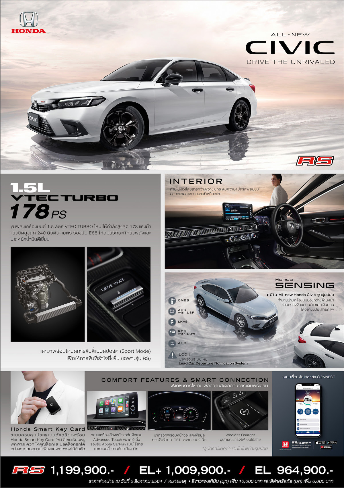 บริษัท ฮอนด้า ออโตโมบิล (ประเทศไทย) จำกัด เปิดตัว ฮอนด้า ซีวิค ใหม่ เจเนอเรชันที่ 11 ตอกย้ำความเป็นไอคอนของยนตรกรรมสปอร์ตพรีเมียมซีดาน ที่ได้รับการพัฒนาดีเอ็นเอความสปอร์ตอันเป็นเอกลักษณ์ให้ก้าวล้ำตลอด 10 เจเนอเรชันที่ผ่านมา ครั้งนี้ ฮอนด้า ซีวิค เจเนอเรชันที่ 11 พร้อมแล้วที่จะสร้างมาตรฐานใหม่ให้กับวงการยานยนต์อีกครั้ง ด้วยดีไซน์ภายนอกสปอร์ตพรีเมียมในทุกมุมมอง เสริมความโฉบเฉี่ยวเร้าใจด้วยรุ่น RS ดีไซน์สุดเอกซ์คลูซีฟสไตล์สปอร์ตที่ตกแต่งพิเศษด้วยโทนสีดำรอบคัน พร้อมปลอกท่อไอเสียคู่ ภายในห้องโดยสารกว้างขวางสะดวกสบาย พร้อมโหมดการขับขี่ที่เลือกได้ถึง 3 โหมด นอกจากนี้ ในทุกรุ่นย่อย ให้ความแรงทรงพลังเร้าใจเกินใคร ด้วยเครื่องยนต์ VTEC TURBO 1.5 ลิตร ใหม่ พร้อมระบบเกียร์ CVT ให้กำลังสูงสุด 178 แรงม้า ให้อัตราการประหยัดน้ำมันดีเยี่ยม 17.2 กม./ลิตร ทั้งยังรองรับพลังงานทางเลือก E85 และมาพร้อมเทคโนโลยีความปลอดภัยอัจฉริยะ ฮอนด้า เซนส์ซิ่ง (Honda SENSING) ที่ยกระดับไปอีกขั้นกับระบบใหม่ Lead Car Departure Notification System (LCDN) สะดวกสบายแบบเหนือกว่ากับครั้งแรกของระบบควบคุมประตูแบบอัจฉริยะพร้อม Honda Smart Key Card ครบครันด้วยเทคโนโลยีเพื่อความสะดวกสบายและเทคโนโลยีความปลอดภัยอันล้ำสมัย โดยพร้อมให้สัมผัสได้ที่โชว์รูมฮอนด้าทั่วประเทศ ตั้งแต่ 6 สิงหาคม 2564 เป็นต้นไป ด้วยราคาจำหน่ายเริ่มต้น 964,900 บาท