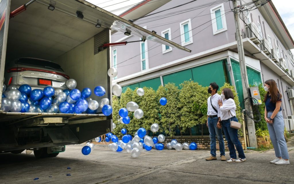 การแพร่ระบาดของโรคโควิด-19 ก่อนนำขึ้นรถสไลด์ ในส่วนของตัวรถสไลด์นั้น ตกแต่งด้วยภาพกล่องของขวัญขนาดใหญ่สวยงาม ภายในบรรจุไปด้วยลูกโป่งกว่า 400 ลูก พร้อมเค้กฉลองครบรอบวันแต่งงานและช่อดอกไม้แสดงความยินดี จาก เกรท วอลล์ มอเตอร์ ช่วยสร้างบรรยากาศอันอบอุ่นและเปี่ยมไปด้วยภาพความประทับใจที่ตอบโจทย์ความต้องการของลูกค้าในการส่งมอบรถครั้งนี้ได้เป็นอย่างดี