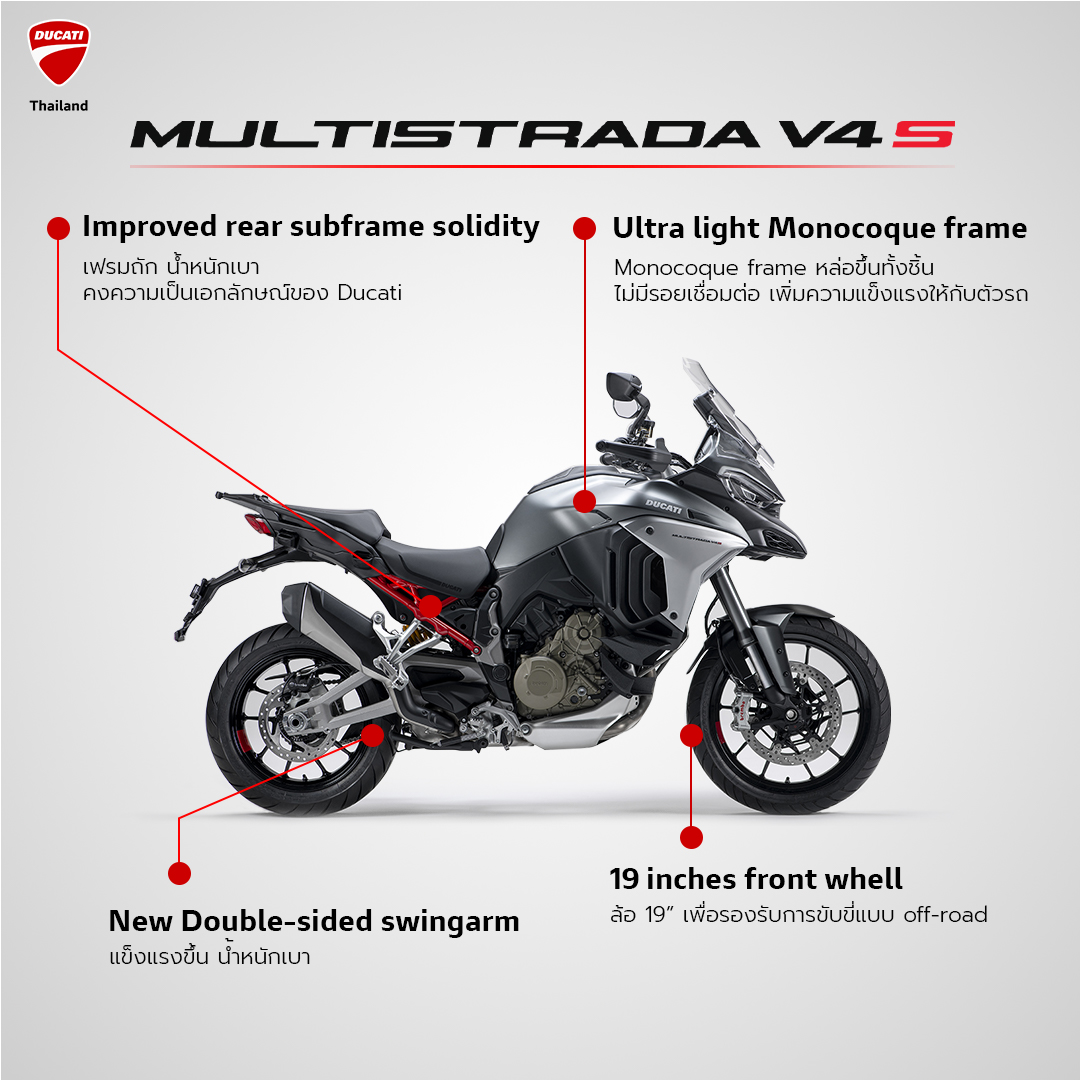 Multistrada V4S ถูกออกแบบให้มีความแข็งแกร่ง สวยงาม และพิถีพิถันในทุกรายละเอียด รวมถึง Monocoque frame เป็นเฟรมที่มักเห็นอยู่ในรถซุปเปอร์ไบค์ราคาสูงๆ เสมอ จุดเด่นของเฟรมโมโนค็อกนั้นเป็นนวัตกรรมที่แตกต่างจากเฟรมรถทั่วไป ตรงที่ เฟรมโมโนค็อกนี้เป็นการหล่อขึ้นมาแบบชิ้นเดียวไม่มีจุดเชื่อมต่อใดๆ จึงทำให้มีความแข็งแรงมากที่สุด เพื่อรองรับได้กับทุกสภาพถนนและเพื่อให้ Ducati Multistrada V4S เป็นรถที่สมบูรณ์แบบมากที่สุดดูคาติจึงได้หยิบนวัตกรรมนี้เข้ามาใช้กับ Ducati Multistrada V4S