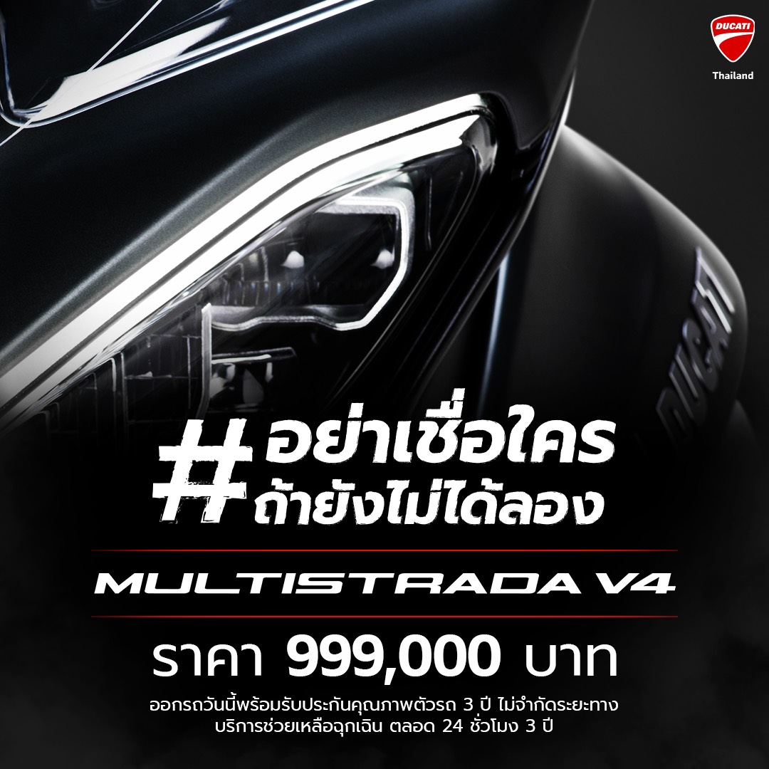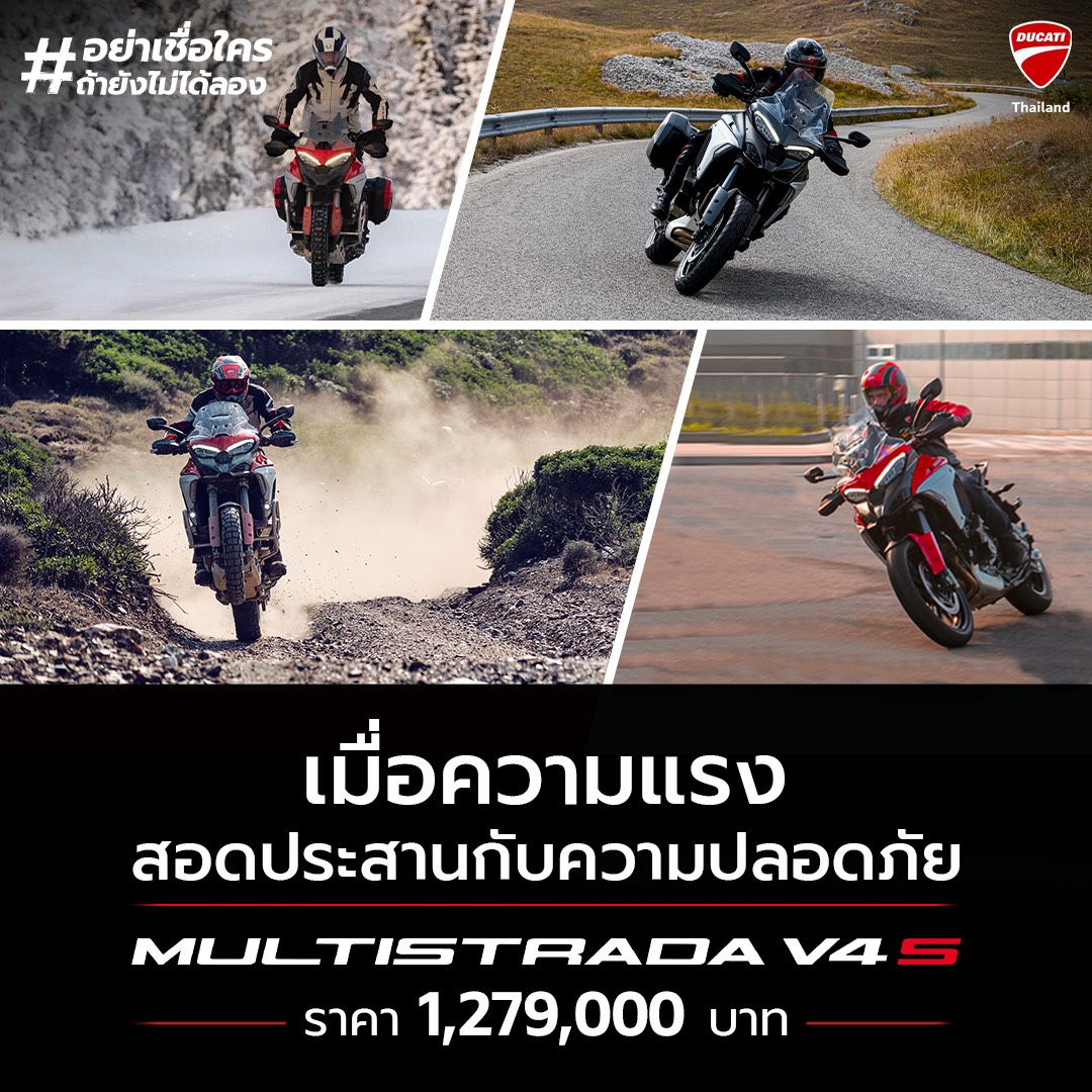 ดูคาติ ประเทศไทย รุกหนัก เปิดตัวบิ๊กไบค์สุดล้ำ Ducati Multistrada V4S ครั้งแรกในประเทศไทย ตอกย้ำจุดยืนผู้นำสุดยอดนวัตกรรมระดับสนามแข่ง โดดเด่นด้วยเทคโนโลยีระบบความปลอดภัยสุดล้ำ Front and Rear Radar เป็นค่ายแรกของโลก และสุดยอดสมรรถนะจากประสิทธิภาพของเครื่องยนต์ตัวแรง Ducati V4 Granturismo ที่ดีที่สุดของ Ducati แข็งแกร่งทนทานด้วยรอบเซอร์วิสวาล์วที่ 60,000 กิโลเมตร พร้อมเปิดให้จองแล้วตั้งแต่วันนี้ ที่โชว์รูมดูคาติทุกแห่ง และบนช่องทางออนไลน์ ในราคา 1,279,000 บาท มั่นใจตอบโจทย์เหล่าดูคาทิสต้าและไบเกอร์ กับความท้าทายซึ่งต้องพิสูจน์ด้วยตัวเองเท่านั้น ถึงความแรงกับความปลอดภัยที่ประสานกันอย่างลงตัว #อย่าเชื่อใครถ้ายังไม่เคยลองMultistradaV4S