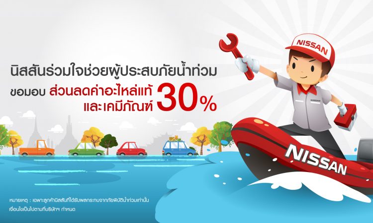 นิสสัน ประเทศไทย ร่วมใจช่วยผู้ประสบภัยน้ำท่วม พร้อมช่วยเหลือลูกค้านิสสันที่รถยนต์ได้รับความเสียหายจากน้ำท่วม ให้บริการรถลาก/รถยก จากบริเวณพื้นที่น้ำท่วมไปยังศูนย์บริการนิสสันที่ใกล้ที่สุดฟรี ถึง 30 กันยายน 2564 พร้อมมอบส่วนลด 30 % สำหรับค่าอะไหล่แท้, เคมีภัณฑ์, น้ำมันหล่อลื่น, ยาง และอุปกรณ์ตกแต่ง ตั้งแต่วันนี้ไปจนถึง 31 ธันวาคม 2564