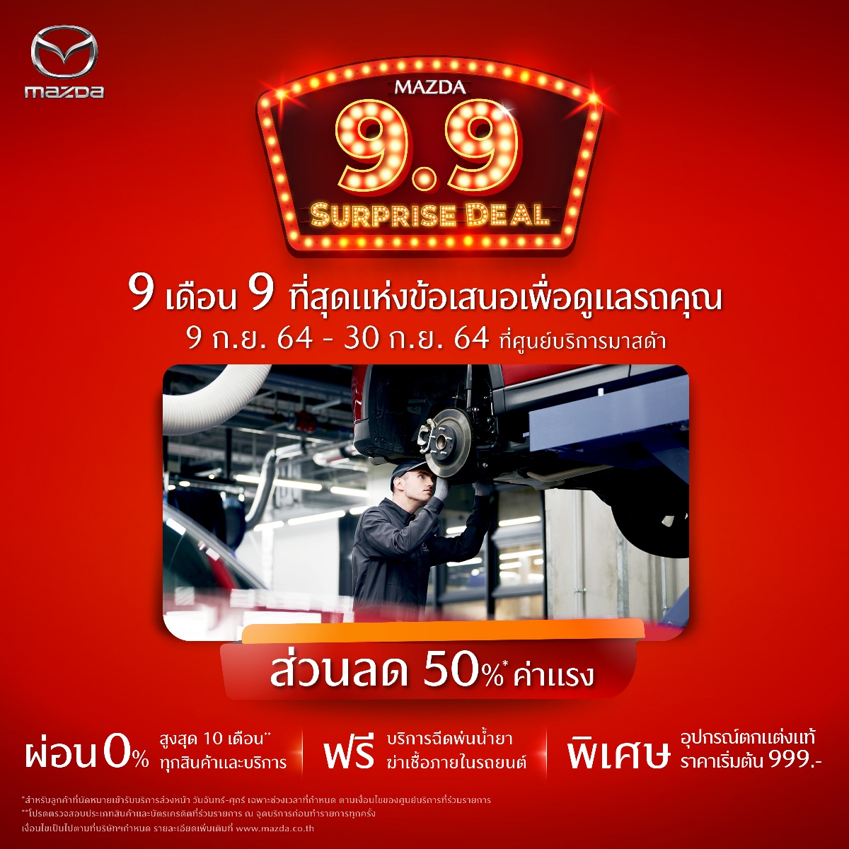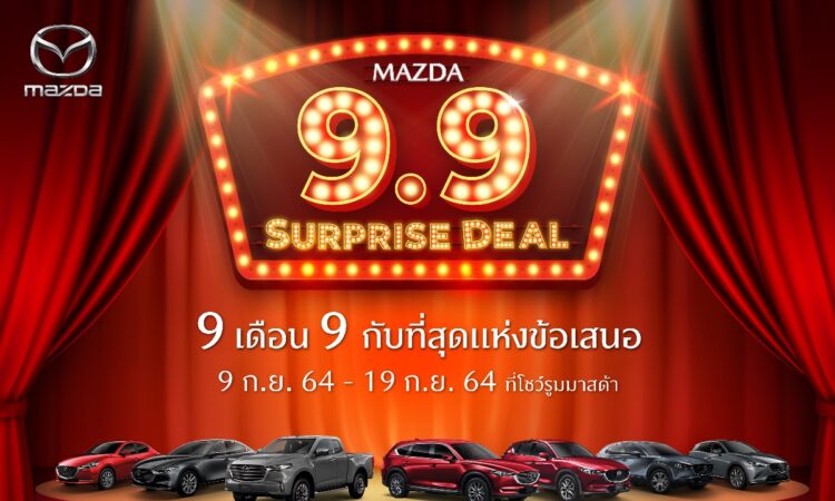 มาสด้าอัดแคมเปญแรง “Mazda 9.9 Surprise Deal” ดอกเบี้ย 0% ขับฟรี 90 วัน ส่วนลดค่าแรง 50% อุปกรณ์ตกแต่งแท้ราคาเริ่มต้น 999 บาท