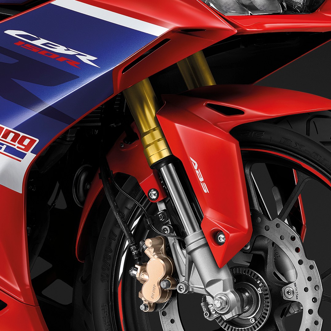 All New CBR150R ได้รับการยกระดับระบบกันสะเทือน ด้วยการใช้โช้กหน้าแบบหัวกลับ (Upside-down Shock Absorber) จากแบรนด์ SHOWA พร้อมยกระดับความปลอดภัยด้วยดิ