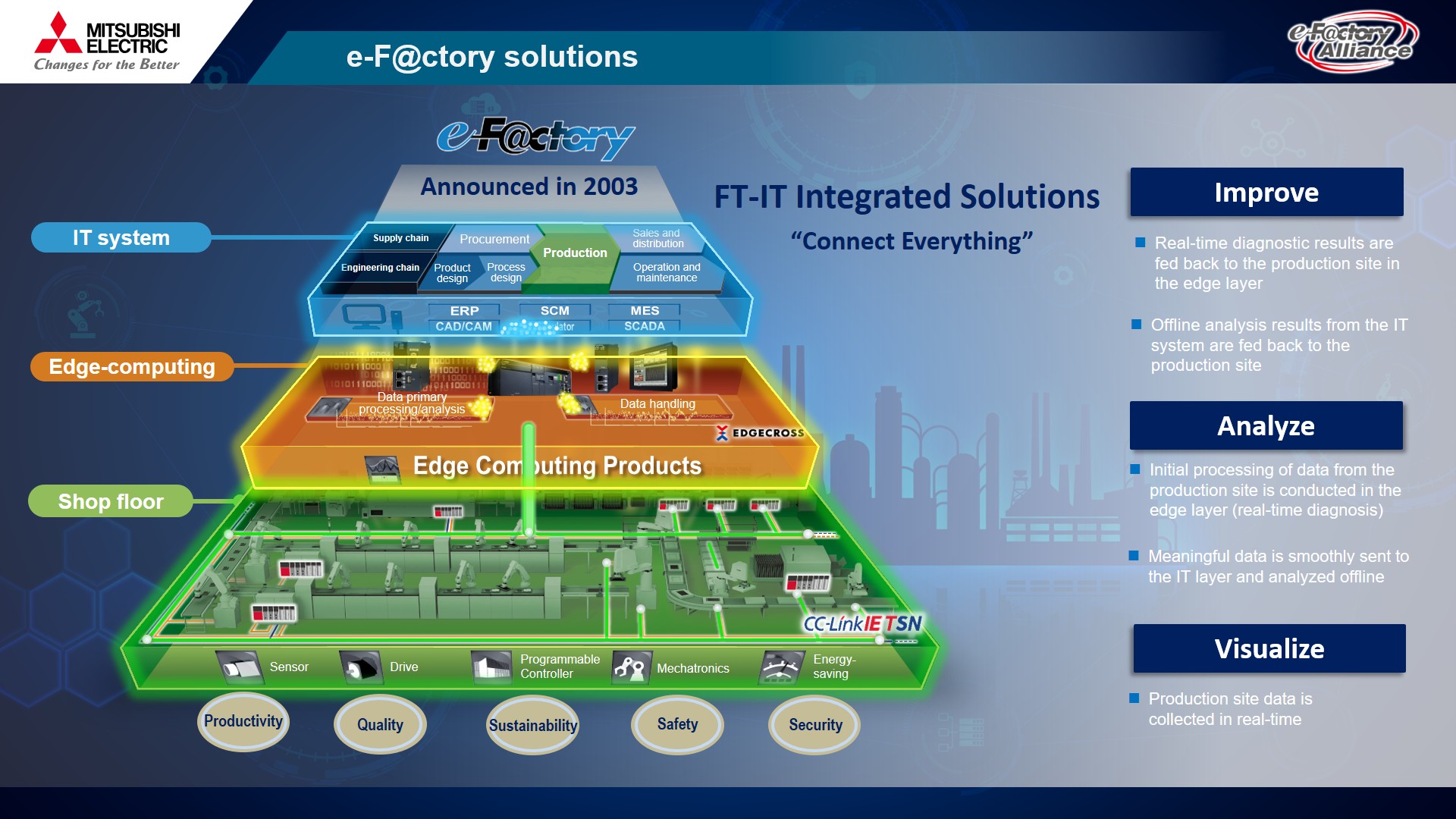 ปัจจุบัน Mitsubishi Electric ร่วมกับพันธมิตร (e-F@ctory’s alliance) ในการพัฒนาโซลูชั่นต่าง ๆ ซึ่งมีหลายส่วนพร้อมแล้วที่จะให้ผู้ประกอบการสามารถนำไปปรับใช้งานได้จริง ตัวอย่างเช่น 5G Remote Solution, Automated Mobile Robot (AMR), Automated Storage and Retrieval System (AS/RS) หรือ การเชื่อมต่อระบบ IT กับ OT โดยมี Cyber Security นอกจากนี้ยังมีโรงงานพันธมิตรที่พัฒนาการผลิตตามแนวทาง e-F@ctory และ SMKL (Smart Manufacturing Kaizen Level) โดยปรับใช้โซลูชั่นจากกลุ่มพันธมิตร (e-F@ctory Alliance) ในประเทศไทย อาทิ บริษัท ซีพีเอฟ (ประเทศไทย) จำกัด (มหาชน) บริษัท สยามคอมเพรสเซอร์ อุตสาหกรรม จำกัด และบริษัท ยาวาต้า (ประเทศไทย) จำกัด เป็นต้น ซึ่งโรงงานพันธมิตรพร้อมที่จะต้อนรับผู้ประกอบการในอุตสาหกรรมต่าง ๆ เพื่อเข้าเยี่ยมชมโรงงานและแชร์ประสบการณ์ในการนำไปปรับใช้