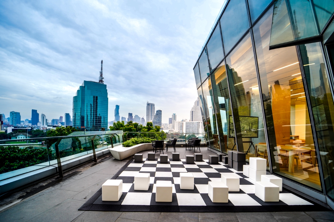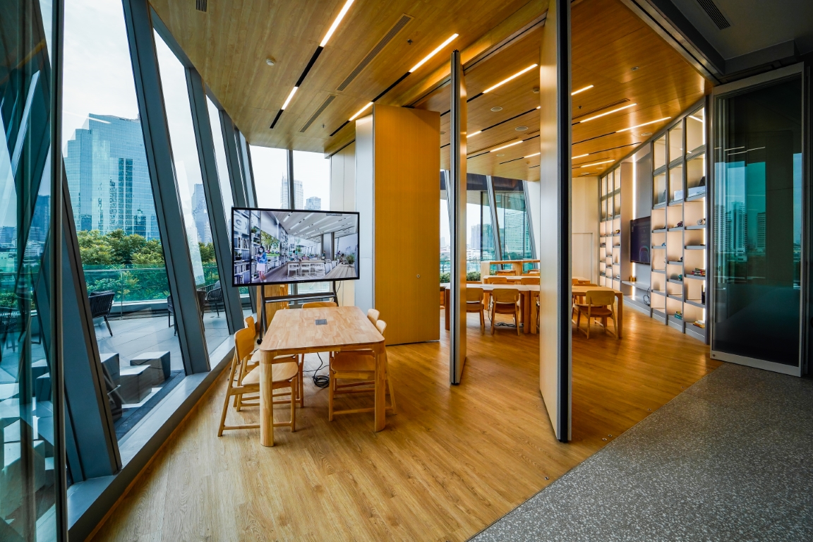 พื้นที่ห้องประชุม 2 ห้อง ซึ่งสามารถรองรับได้ถึง 40 ที่นั่ง โดดเด่นด้วยการออกแบบเป็นกระจกบานใหญ่เพื่อให้สามารถประชุมพร้อมชื่นชมทัศนียภาพอันสวยงามของแม่น้ำเจ้าพระยาได้อย่างเต็มที่ โดยไฮไลท์สำคัญของโซนนี้คือ จอ Interactive Smart Board แบบทัชสกรีน ขนาด 86 นิ้ว ที่รวมเทคโนโลยีสุดล้ำที่เอื้อต่อการทำงานแบบมืออาชีพเข้าไว้ด้วยกัน ไม่ว่าจะเป็นการใช้งานแบบการเขียนกระดานไวท์บอร์ดทั่วไป การใช้เป็นโปรเจคเตอร์ นำเสนองาน หรือการประชุมผ่านวิดีโอ Conference และยังสามารถแชร์หน้าจอได้ถึง 4 หน้าจอพร้อมกัน รวมไปความสามารถในการบันทึก แชร์เนื้อหาและเสียงจากการประชุมจาก Smart Board ไปยังคอมพิวเตอร์ โน๊ตบุ๊ค แท็บเล็ต หรือโทรศัพท์ได้ในทันที นับเป็นเทคโนโลยีที่ตอบโจทย์การทำงานในยุคนี้ได้อย่างยอดเยี่ยม
