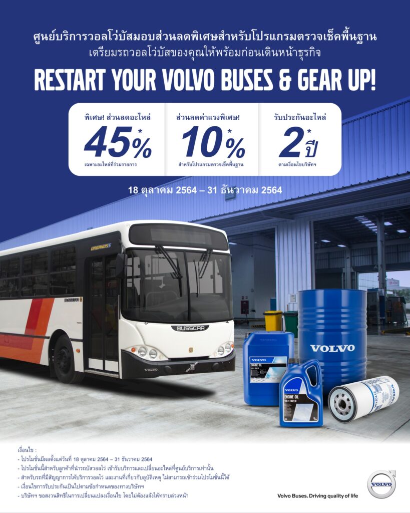 บริษัท วอลโว่ บัส (ประเทศไทย) จำกัด ซึ่งเป็นผลิตและจัดจำหน่ายรถบัสสายพันธุ์สวีเดน วอลโว่ บัส อย่างเป็นทางการในประเทศไทย เชิญชวนลูกค้านำรถวอลโว่ บัส เข้ารับการตรวจเช็คใหญ่เพื่อรับกับนโยบายการเปิดประเทศต้อนรับนักท่องเที่ยวของรัฐบาล โดยจัดโปรโมชันพิเศษสำหรับการเข้าเช็คใหญ่ ภายใต้แคมเปญ “Restart Your Volvo Buses and Gear Up” โดยลดค่าอะไหล่ที่ร่วมรายการ 45%