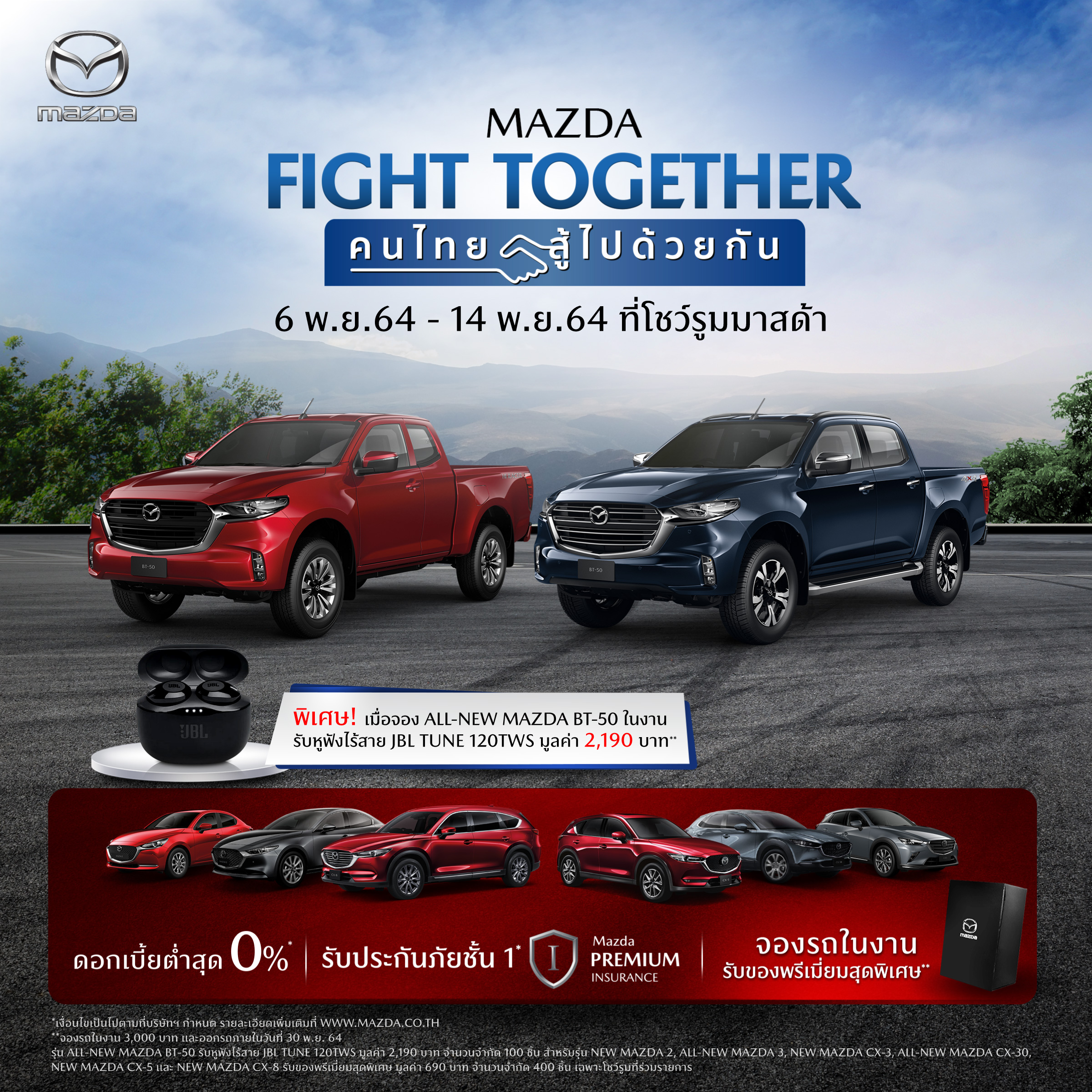 เตรียมเปิดเกมส์รุกกระตุ้นกำลังซื้อในช่วงปลายปีเต็มกำลัง ด้วยการส่งแคมเปญ MAZDA FIGHT TOGETHER ปลุกพลังใจให้คนไทยสู้ไปด้วยกัน ด้วยการขอความร่วมมือให้ผู้จำหน่ายในแต่ละพื้นที่ให้ความช่วยเหลือธุรกิจ SME ของลูกค้าให้กลับมาเริ่มต้นเดินหน้าทำธุรกิจได้อีกครั้งหลังจากต้องเผชิญกับวิกฤตโควิดมาตลอดเกือบ 2 ปี พร้อมมอบข้อเสนอสุดพิเศษเพื่อให้ลูกค้าเป็นเจ้าของยนตรกรรมมาสด้าได้ง่ายขึ้น กับดอกเบี้ยต่ำสุด 0% ฟรีประกันภัยชั้น 1 รับของพรีเมี่ยมสุดพิเศษเมื่อจองภายในงาน ระหว่างวันที่ 6 – 14 พฤศจิกายน 2564 ที่โชว์รูมมาสด้า