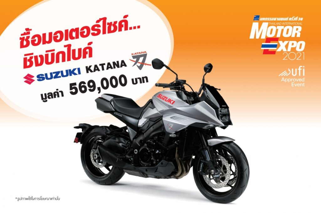 - “ซื้อมอเตอร์ไซค์…ชิงบิกไบค์” เมื่อจองหรือซื้อรถจักรยานยนต์ใหม่ในงาน มีสิทธิ์ชิงรางวัล รถจักรยานยนต์ SUZUKI BIG BIKE รุ่น KATANA ราคา 569,000 บาท จำนวน 1 รางวัล