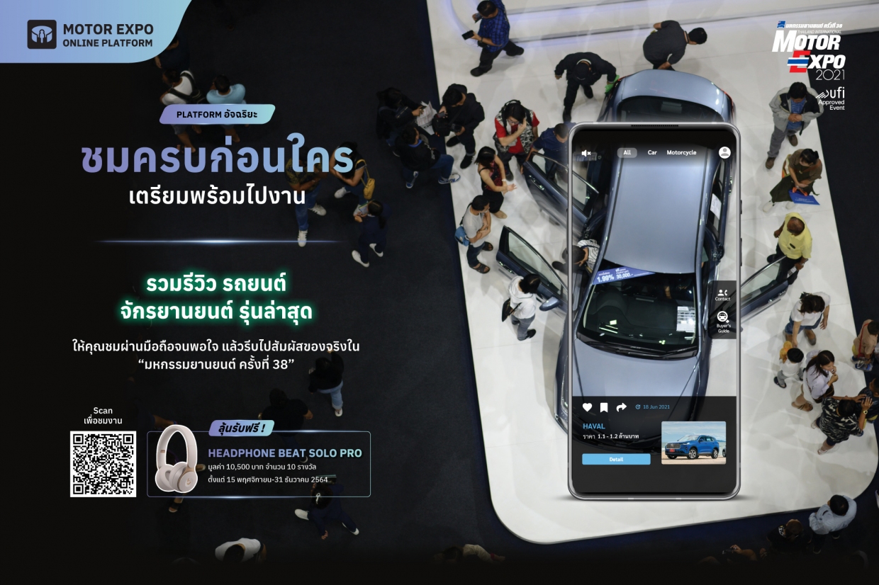 - “ชม MOTOR EXPO ONLINE ชิงรางวัล” ผู้ชมงาน MOTOR EXPO ONLINE PLATFORM ผ่านลิงค์จาก https://ve.motorexpo.co.th มีสิทธิ์ลงทะเบียนเพื่อชิงรางวัล Headphone Beats Solo Pro Wireless Noise Cancelling จำนวน 10 รางวัล มูลค่ารางวัลละ 10,500 บาท รวมมูลค่า 105,000 บาท