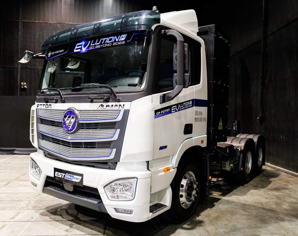 -Auman EST iBlue280 รถบรรทุก 10 ล้อ หัวลาก ขนาดใหญ่ น้ำหนักบรรทุก รวมน้ำหนักลากจูง 49 ตัน เหมาะสำหรับงานขนส่งตู้สินค้าขนาดใหญ่ มาพร้อมแบตเตอรี่ ขนาดความจุ 282 กิโลวัตต์ ให้กำลังมอเตอร์ขับเคลื่อนสูงถึง 360 กิโลวัตต์ หรือ 482 แรงม้า รับงานลากจูงได้ไกลกว่า 200 กม.