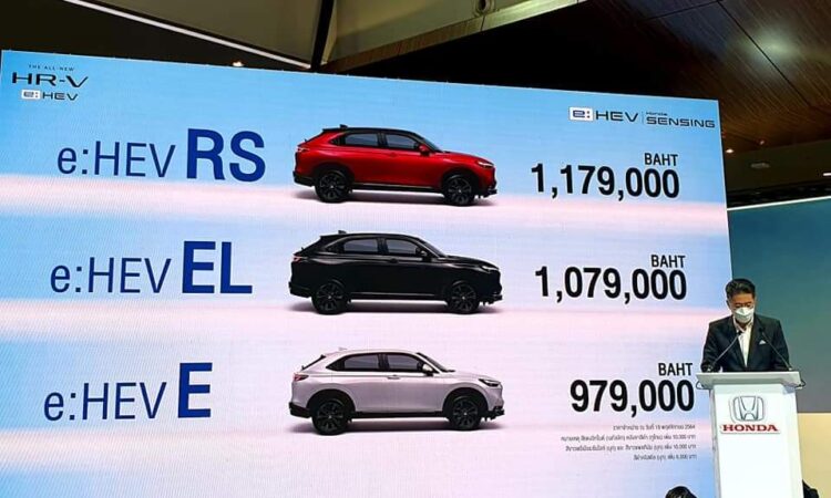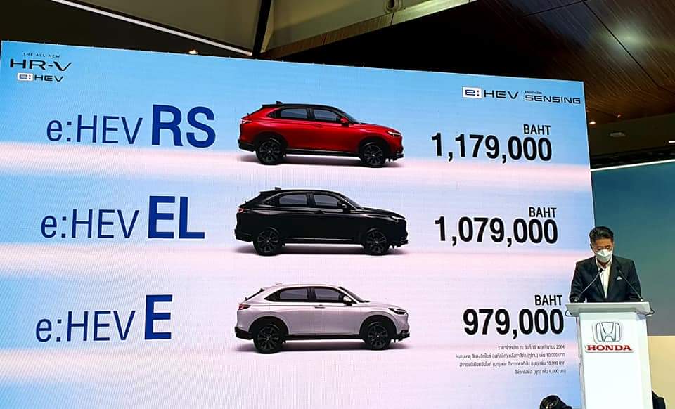 ฮอนด้า ประกาศราคาและเปิดจำหน่าย ฮอนด้า เอชอาร์-วี อี:เอชอีวี ใหม่ อย่างเป็นทางการ โดยรุ่น e:HEV E ราคา 979,000 บาท รุ่น e:HEV EL ราคา 1,079,000 บาท และรุ่น e:HEV RS ราคา 1,179,000 บาท