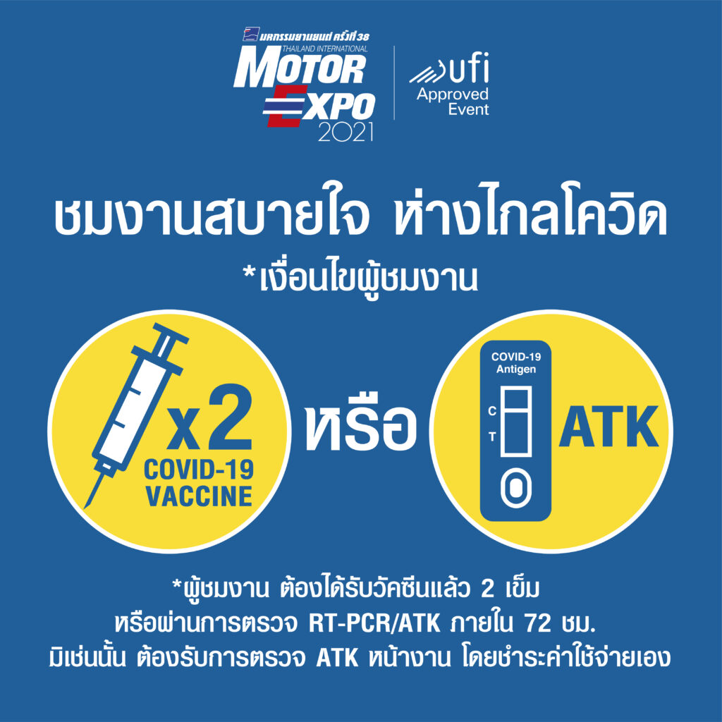 นายขวัญชัย ปภัสร์พงษ์ ประธานจัดงาน “มหกรรมยานยนต์ ครั้งที่ 38” เปิดเผยว่า “ขณะนี้ผ่านครึ่งทางการจัดงานด้วยความราบรื่น ทุกฝ่ายที่เกี่ยวข้องให้ความร่วมมือ ปฏิบัติตามมาตรการป้องกันการแพร่ระบาดของ COVID-19 อย่างเคร่งครัด รวมถึงผู้เข้าชมงานก็ให้ความร่วมมือเป็นอย่างดี ถึงแม้จะมีขั้นตอนการเข้าชมเพิ่มขึ้น ทั้งนี้ต้องขอขอบคุณภาครัฐและทุกหน่วยงาน ที่ให้คำปรึกษาแนะนำเรื่องการกำหนดมาตรการต่างๆ ตลอดจนพันธมิตร Finno-Health ที่ให้บริการตรวจ ATK ผู้เกี่ยวข้องในการจัดงานทุก 7 วัน และ โรงพยาบาลบางประกอก 9 สนับสนุนตรวจ ATK ผู้เข้าชมงานทั่วไปที่ยังรับวัคซีนไม่ครบ 2 เข็ม ในราคาพิเศษเพียง 99 บาท”