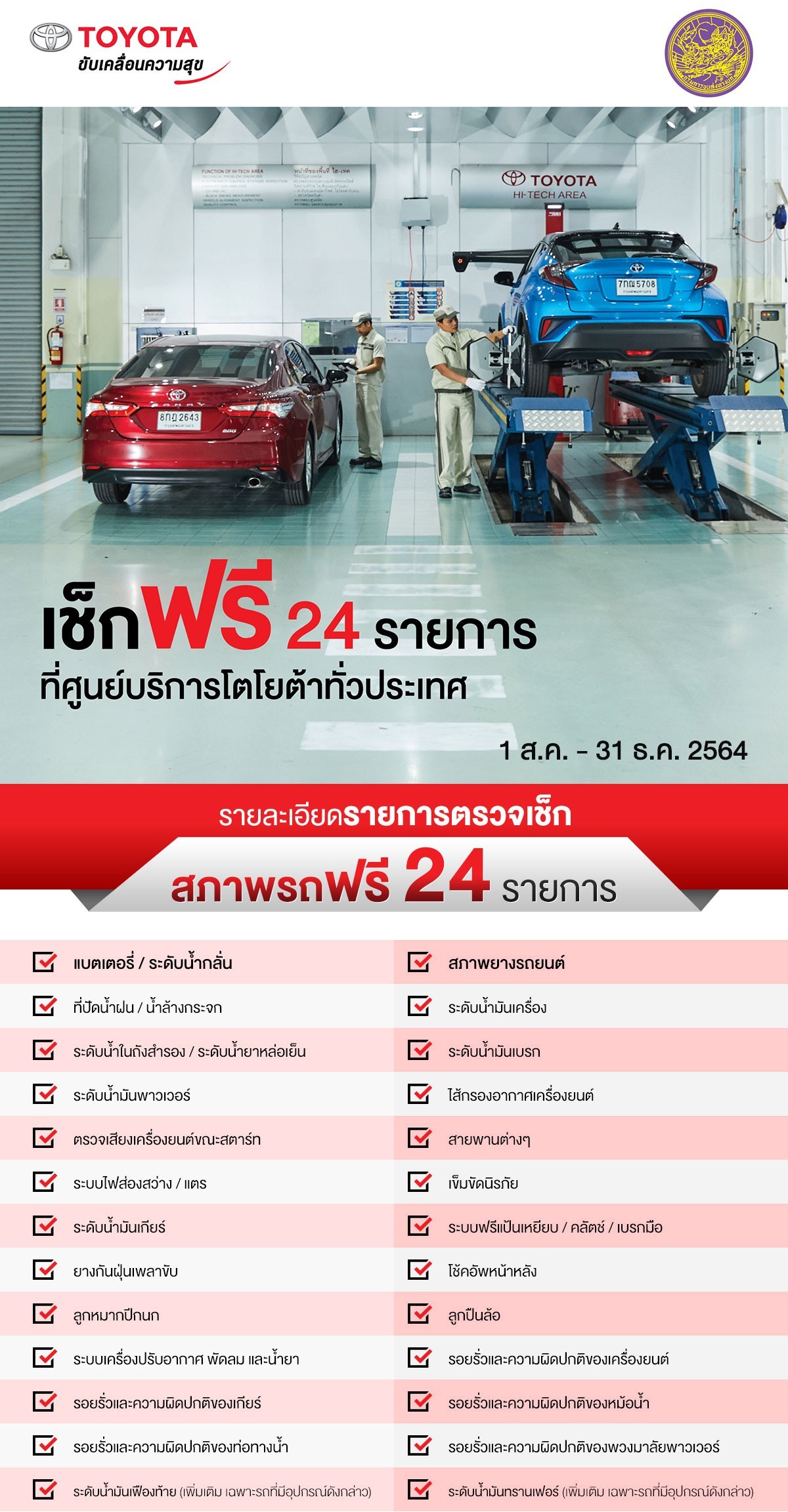 และตรวจเช็กสภาพรถยนต์ฟรี 24 รายการ ในช่วงเทศกาลท่องเที่ยวปีใหม่ เพื่อเป็นการเตรียมความพร้อมรถยนต์ให้อยู่ในสภาพสมบูรณ์ และป้องกันการเกิดอุบัติเหตุ ซึ่งผู้ที่สนใจสามารถนำรถยนต์ไปตรวจเช็กได้ตั้งแต่วันที่1 สิงหาคม 2564 – 31 ธันวาคม 2564 โดยมีรายการตรวจเช็ก 24 รายการ ดังนี้