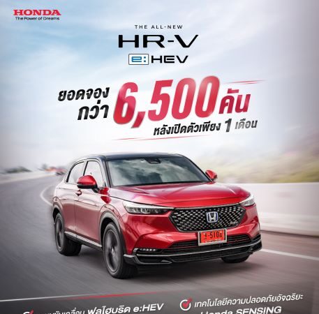 บริษัท ฮอนด้า ออโตโมบิล (ประเทศไทย) จำกัด ขอบคุณพลังความเชื่อมั่นและความไว้วางใจจากลูกค้า ประกาศความสำเร็จยอดจอง ฮอนด้า เอชอาร์-วี อี:เอชอีวี ใหม่ ได้รับกระแสตอบรับดีเยี่ยม กวาดยอดจองทั่วประเทศแล้วกว่า 6,500 คัน หลังจากการประกาศราคาและเปิดจำหน่ายอย่างเป็นทางการเพียง 1 เดือน ตอกย้ำการเป็นสปอร์ตพรีเมียมเอสยูวีที่สมบูรณ์แบบสำหรับทุกคนอย่างแท้จริง ด้วยเทคโนโลยีระบบขับเคลื่อนฟูลไฮบริด e:HEV ที่มอบสมรรถนะการขับขี่อันทรงพลังและประหยัดน้ำมันดีเยี่ยม และเทคโนโลยีความปลอดภัยอัจฉริยะ ฮอนด้า เซนส์ซิ่ง (Honda SENSING) ในทุกรุ่นย่อย พร้อมขับเคลื่อนความสำเร็จในฐานะผู้นำตลาดเอสยูวีในประเทศไทย