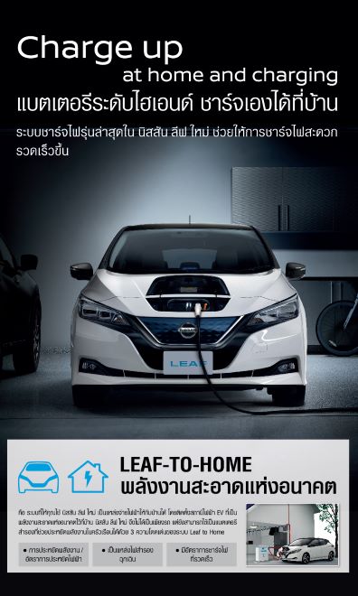 นิสสัน เป็นผู้นําระดับโลกในฐานะผู้ผลิตรถยนต์ไฟฟ้าออกจำหน่ายจํานวนมาก โดย นิสสัน ลีฟ มีชื่อเสียงในการมอบประสบการณ์การขับขี่ที่ไม่เหมือนใคร ด้วยระบบส่งกําลังขั้นสูง เร่งความเร็วได้อย่างราบรื่นและตอบสนองได้ดี ขับขี่ได้อย่างมั่นคง และให้ความเงียบ นิสสัน ลีฟ ได้เปิดตัวในฐานะรถยนต์ไฟฟ้า 100% คันแรกของโลกที่ออกแบบมาสําหรับตลาดมวลชนและเป็นหนึ่งในรถยนต์ไฟฟ้าเพียงไม่กี่รุ่นที่จำหน่ายในประเทศไทย ที่สามารถป้อนไฟฟ้าให้กับที่พักอาศัย (V2H) ได้โดยตรง ผ่านการชาร์จด้วยระบบชาร์จ CHAdeMO ที่ได้ออกแบบตั้งแต่เริ่มต้นเพื่อรองรับการชาร์จแบบสองทิศทาง ซึ่งได้รับการรับรองในหลายประเทศทั่วโลก นิสสัน ลีฟ จึงสามารถรองรับระบบป้อนไฟฟ้าสำหรับที่พักอาศัย เชื่อมต่อกับระบบโครงข่ายไฟฟ้าและอื่น ๆ ได้ตามความต้องการของผู้ใช้รถยนต์ควบคู่ไปพร้อมกันถึงสองระบบ เท่ากับเป็นการเพิ่มความหลากหลายในการใช้งาน เสถียรภาพของพลังงาน และความมั่นใจ จึงทำให้ผู้ใช้รถยนต์มีความอุ่นใจได้ ไม่ว่าจะเป็นการขับขี่รถยนต์บนท้องถนนหรือใช้งานที่บ้าน