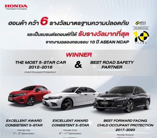 บริษัท ฮอนด้า ออโตโมบิล (ประเทศไทย) จำกัด ประกาศความสำเร็จจากการคว้า 6 รางวัลด้านความปลอดภัย ในงานฉลองครบรอบ 10 ปี ASEAN NCAP (New Car Assessment Program for Southeast Asian) โดยเป็นแบรนด์ผู้ผลิตรถยนต์ที่ได้รับรางวัลมากที่สุดภายในงาน สะท้อนถึงความมุ่งมั่นในการสร้างสรรค์และนำเสนอยนตรกรรมคุณภาพที่มาพร้อมเทคโนโลยีความปลอดภัยสูงสุดในหลากหลายเซกเมนต์ ตอกย้ำเจตนารมณ์ในการสร้างสังคมปลอดอุบัติเหตุอย่างยั่งยืน ที่พร้อมมอบความมั่นใจและความสุขสำหรับผู้ใช้รถใช้ถนนทุกคนในทุกเส้นทาง