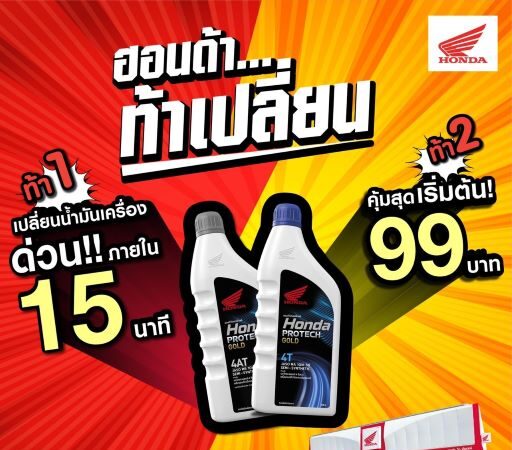 แคมเปญ “ฮอนด้าท้าเปลี่ยน” มอบบริการเปลี่ยนน้ำมันเครื่องด่วนพิเศษภายใน 15 นาที ด้วยราคาเริ่มต้นเพียง 99 บาท (Honda Protech Gold Semi Synthetic 0.7L) รับประกันความพึงพอใจด้วย 2 คำท้าเพื่อลูกค้าทุกคน