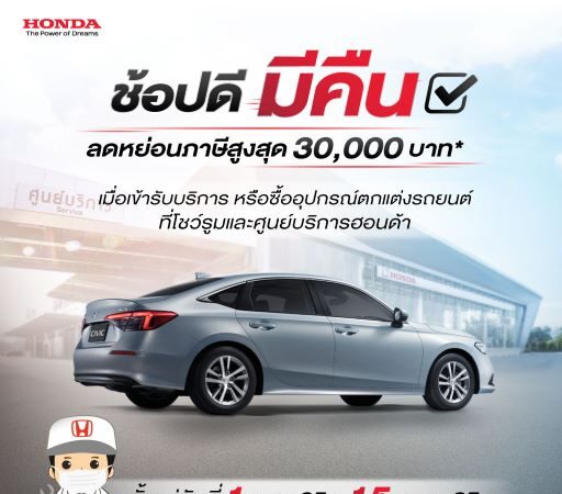 บริษัท ฮอนด้า ออโตโมบิล (ประเทศไทย) ชวนลูกค้าฮอนด้าเข้ารับบริการเพื่อรับสิทธิ์ลดหย่อนภาษี โครงการ “ช้อปดีมีคืน 2565” ณ โชว์รูมและศูนย์บริการฮอนด้า 229 แห่งทั่วประเทศ โดยลูกค้าสามารถนำใบเสร็จรับเงินหรือใบกำกับภาษีเต็มรูปแบบจากยอดค่าใช้จ่ายจริง สูงสุด 30,000 บาท ตั้งแต่วันที่ 1 มกราคม – 15 กุมภาพันธ์ 2565 มาใช้ลดหย่อนภาษีเงินได้บุคคลธรรมดาประจำปีภาษี 2565 ซึ่งค่าใช้จ่ายงานบริการที่เข้าร่วมเงื่อนไขในโครงการ “ช้อปดีมีคืน”* ได้แก่ งานตรวจเช็กตามระยะทาง (PM) งานซ่อมทั่วไป (GR) และงานซ่อมตัวถังและสี (BP) ประเภทลูกค้าเป็นผู้ชำระเงิน รวมถึงค่าใช้จ่ายในการซื้อชุดอุปกรณ์ตกแต่งที่โชว์รูมและศูนย์บริการอีกด้วย