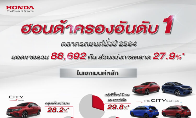 บริษัท ฮอนด้า ออโตโมบิล (ประเทศไทย) จำกัด ประกาศผลการดำเนินงานประจำปี 2564 สามารถครองอันดับ 1 ตลาดรถยนต์นั่งส่วนบุคคลปี 2564 ในประเทศไทย (มกราคม – ธันวาคม 2564) ด้วยยอดจำหน่ายสะสมรวม 88,692 คัน ครองส่วนแบ่งทางการตลาด 27.9% และครองอันดับ 1 ต่อเนื่องอีกปี อีกทั้งเป็นผู้นำใน 4 เซกเมนต์หลัก ตอกย้ำการเป็นแบรนด์ยอดนิยมในประเทศไทย พร้อมเดินหน้าสร้างความพึงพอใจสูงสุดให้แก่ลูกค้าด้วยการยกระดับการบริการหลังการขายที่ตอบโจทย์ไลฟ์สไตล์ที่หลากหลาย ภายใต้มาตรฐานเดียวกันจากโชว์รูมและศูนย์บริการ 229 แห่งทั่วประเทศ