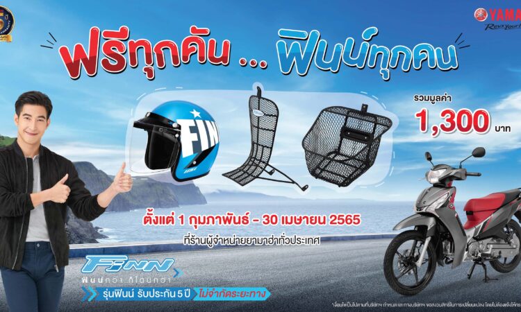 บริษัท ไทยยามาฮ่ามอเตอร์ จำกัด ผู้ผลิตและจำหน่ายรถจักรยานยนต์คุณภาพของเมืองไทย จัดเต็มกับโปรโมชั่นสุดคุ้ม ”ฟรีทุกคัน…ฟินน์ทุกคน” เมื่อซื้อรถจักรยานยนต์ ยามาฮ่า ฟินน์ ระหว่างวันที่ 1 กุมภาพันธ์ – 30 เมษายน 2565 รับของแถมฟรีทันที 3 รายการ รวมมูลค่า 1,300 บาท ได้แก่ 1.หมวกกันน็อก Finn 1 ใบ 2.ตะกร้าหน้า 1 ชิ้น 3.กันลาย 1 ชิ้น พร้อมเพิ่มความมั่นใจในคุณภาพสินค้ากับการรับประกันทั้งคัน 5 ปี ไม่จำกัดระยะทาง กล้าที่จะไป กล้าที่จะเป็น #กล้าที่จะฟินน์