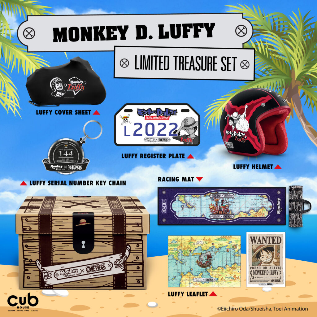 Monkey x One Piece Limited Edition ผลิตจำนวนจำกัดรุ่นละ 150 คัน มาพร้อมชุดเซตที่นักสะสมห้ามพลาด! ประกอบด้วย หมวกกันน็อก, พวงกุญแจเข็มทิศโจรสลัด ระบุลำดับหมายเลข 1-150 ของรถแต่ละรุ่น, แผ่นป้ายะเบียนสไตล์ญี่ปุ่น, พรมลายแผนที่วันพีช, ผ้าคลุมรถที่ดีไซน์เป็น Outline ของเวอร์ชัน Limited Edition และ Leaflet คาแรคเตอร์ของตัวรถ โดยทั้งหมดนี้จะถูกใส่ในอยู่ในหีบสมบัติพรีเมียมบ็อกเซต Limited Treasure Set วางจำหน่ายด้วยราคาแนะนำ 129,900 บาทต่อเซต ที่ร้าน CUB House ทุกสาขา เริ่มตั้งแต่วันที่ 23 กุมภาพันธ์ 2022 เป็นต้นไป