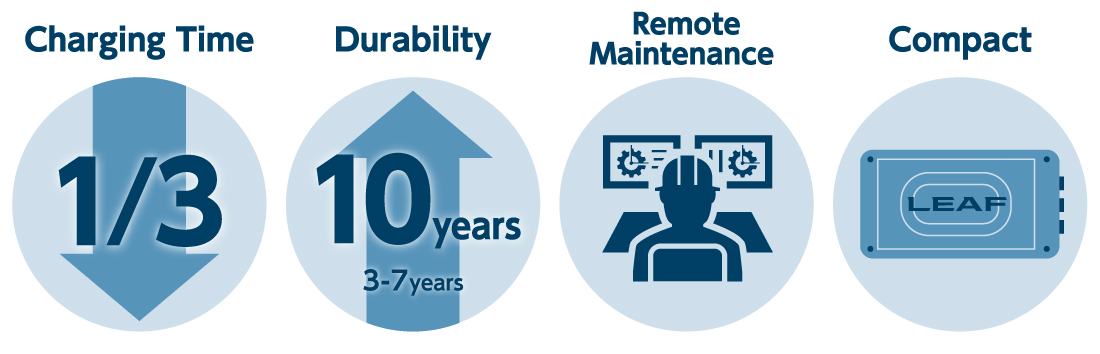 แบตเตอรี่ลิเธียมไอออนที่นำกลับมาใช้ใหม่ใช้เวลาชาร์จเพียง 1/3 ของเวลาในการชาร์จเมื่อเทียบกับแบตเตอรี่ตะกั่วกรด อีกทั้งยังมีความทนทานมากกว่า โดยมีอายุเฉลี่ย 10 ปี เมื่อเทียบกับแบตเตอรี่มาตรฐานทั่วไปที่มีอายุการใช้งาน 3-7 ปี โทชิฮาร่า ผู้สนใจด้านการบำรุงรักษาแบตเตอรี่ อธิบาย