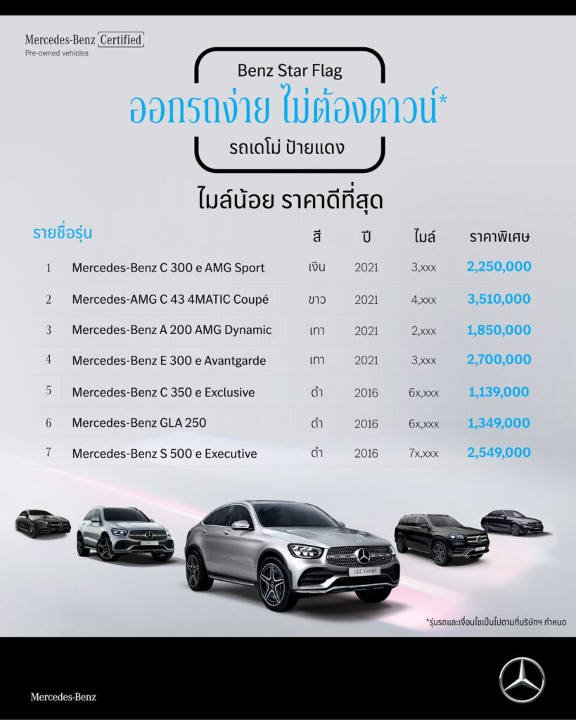 เบนซ์ สตาร์แฟลก ยังคงมุ่งมั่นรักษาความเป็นที่หนึ่งทั้งด้านยอดขายและการบริการหลังการขาย โดยที่ผ่านมามีการจัดดีลดีๆ โปรโมชั่นแรงๆ ตามคอนเซปต์ “Best Deal Guarantee” ให้ลูกค้าแบบไม่ยั้ง สมกับความเชื่อมั่นว่า “ออกรถให้ได้ดีลดีที่สุดต้องที่ เบนซ์ สตาร์แฟลก” ซึ่งเป็นความแตกต่างที่ลูกค้าสามารถเปรียบเทียบได้อย่างชัดเจน สำหรับใครที่กำลังรอคอยแคมเปญมอเตอร์โชว์นั้นยิ้มกว้างได้เลย มีโปรโมชั่นสุดแรงที่จัดมาให้ลูกค้าได้เลือกตัดสินใจก่อนใคร กับโปรโมชั่นตามใจลูกค้า เริ่มจากโปรแกรมผ่อนไร้กังวล ดอกเบี้ย 0% นาน 60 เดือน หรือเลือกดาวน์ 5% หรือเลือกขับฟรี 90 วัน หรือเลือกโปรแกรมบำรุงรักษาและขยายประกันคุณภาพ Mercedes-Benz Service Plus (MBSP) นาน 5 ปี หรือ ประกันภัย 2 ปี (เงื่อนไขเป็นไปตามที่บริษัทฯ กำหนด) นอกจากนี้ ยังมีข้อเสนอพิเศษให้ลูกค้าได้พิจารณาตัดสินใจอีกมากมาย อาทิ นำรถเก่ามา Trade in การรันตีให้ราคาดีกว่า และ Mercedes-Benz Certified (MBC) ไม่ต้องดาวน์ เช่น รุ่น GLA 250 ราคา 1,349,000 บาท ส่วน C350e Exclusive ราคา 1,139,000 บาท