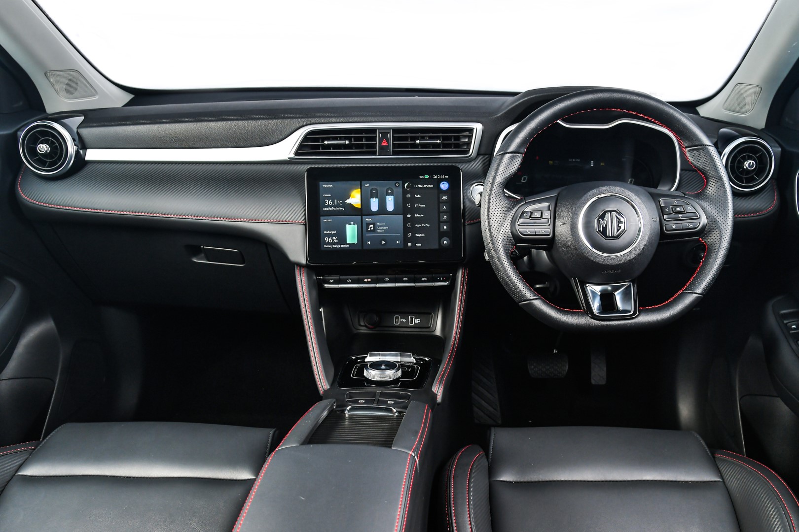 NEW MG ZS EV ได้รับการออกแบบให้มีพื้นที่ภายในกว้างขวาง มาพร้อมดีไซน์เรียบหรู แฝงความสปอร์ต พรีเมี่ยมด้วยคอนโซลหน้าลายคาร์บอนไฟเบอร์ และเบาะหนังดำเดินด้ายแดง พร้อมวัสดุบุนุ่มแบบ Soft Touch และฟังก์ชันการใช้งานที่ครบครัน