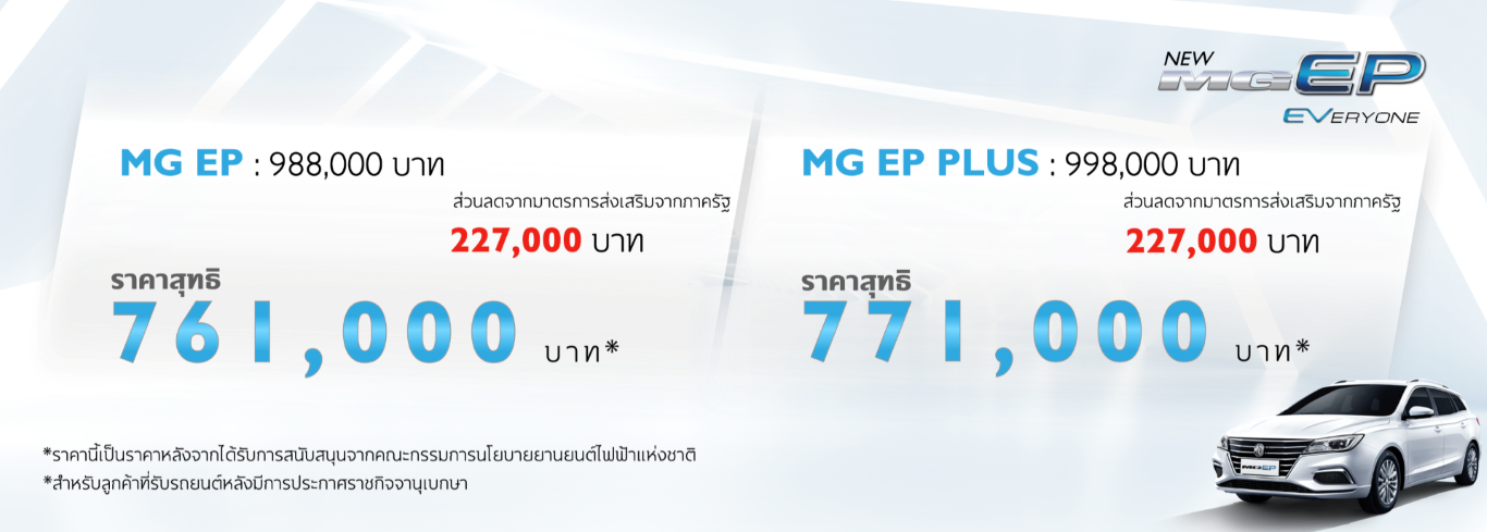 MG EP และ MG EP PLUS รถยนต์พลังงานไฟฟ้า 100% รูปแบบสเตชั่นแวกอน ที่เหมาะสำหรับทุกคน มีความโดดเด่นด้วยฟังก์ชั่น สิ่งอำนวยความสะดวก และเทคโนโลยีต่างๆ ที่เพียงพอต่อการใช้งาน ห้องโดยสารกว้างขวาง พื้นที่บรรทุกสัมภาระมีความจุมากถึง 1,456 ลิตร และมีแบตเตอรี่ขนาดใหญ่ที่วิ่งได้ไกลถึง 380 กิโลเมตรต่อการชาร์จเต็มหนึ่งครั้ง โดย MG EP และ MG EP PLUS เป็นรถอีกหนึ่งรุ่น ที่เข้าร่วมนโยบายสนับสนุนรถยนต์พลังงานไฟฟ้าของภาครัฐ ทำให้ราคาจำหน่ายใหม่เป็นดังนี้