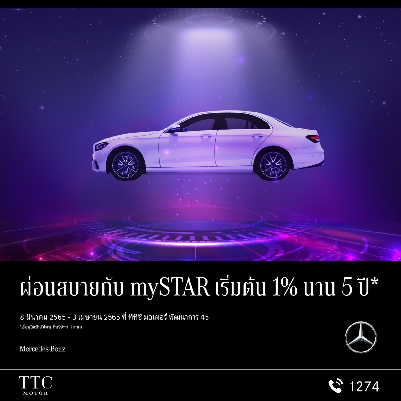 เพียงคุณออกรถที่ TTC Motor รับข้อเสนอเดียวกับงาน Motor Show 2022 ดังนี้ ผ่อนเริ่มต้น 1% ของราคารถ นาน 5 ปี กับโปรแกรม mySTAR* , ฟรี Warranty 5 ปี* ,ฟรี ประกันภัยชั้นหนึ่ง 5 ปี*
