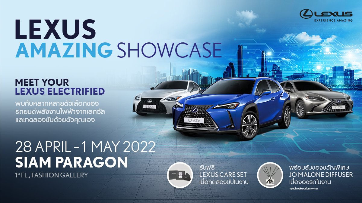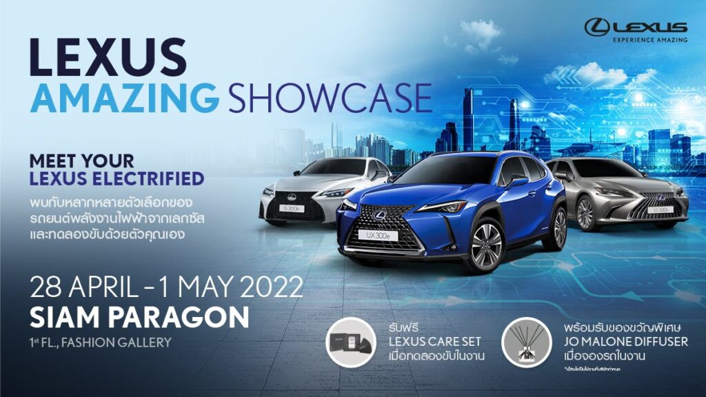 เลกซัส ประเทศไทย ขอเชิญทุกท่านพบกับยนตรกรรมไฟฟ้า Lexus Electrified สุดหรูพร้อมทดลองขับ และรับข้อเสนอสุดพิเศษในงาน “Lexus Amazing Showcase” ณ แฟชั่นแกลเลอรี่ ชั้น 1 ศูนย์การค้าสยามพารากอน ระหว่างวันที่ 28 เมษายน – 1 พฤษภาคม 2565