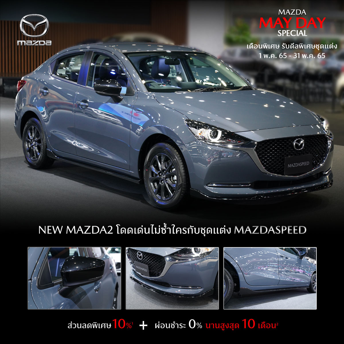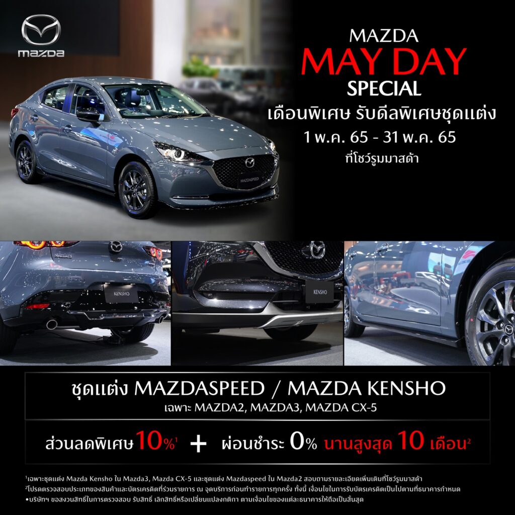 นายธีร์ เพิ่มพงศ์พันธ์ รองประธานบริหารอาวุโส บริษัท มาสด้า เซลส์ (ประเทศไทย) จำกัด กล่าวว่า แคมเปญ “MAZDA MAY DAY SPECIAL” นับเป็นอีกหนึ่งแคมเปญสุดร้อนแรงประจำเดือนพฤษภาคม ที่จัดขึ้นเพื่อมอบความคุ้มค่าให้กับลูกค้าคนพิเศษที่ต้องการเป็นเจ้าของรถมาสด้า ด้วยข้อเสนอสุดพิเศษที่โชว์รูมมาสด้า ระหว่างวันที่ 5 พ.ค. 65 – 15 พ.ค. 65 ด้วยดอกเบี้ยต่ำสุด 0%1 ฟรีประกันภัยชั้น 1 Mazda Premium Insurance และจองรถในงานรับ Mazda Mini Luggage มูลค่า 1,500 บาท และยังมอบข้อเสนอให้กับลูกค้าปัจจุบันที่ต้องการเสริมความสปอร์ตให้กับรถยนต์มาสด้า กับดีลพิเศษชุดแต่งแท้จาก MAZDASPEED และ MAZDA KENSHO สำหรับรถยนต์มาสด้า2, มาสด้า3 และมาสด้า CX-5 โดยมอบส่วนลดพิเศษ 10%3 ผ่อน 0% นานสูงสุด 10 เดือน ระหว่างวันที่ 1 พ.ค. 65 – 31 พ.ค. 65 ที่โชว์รูมมาสด้า