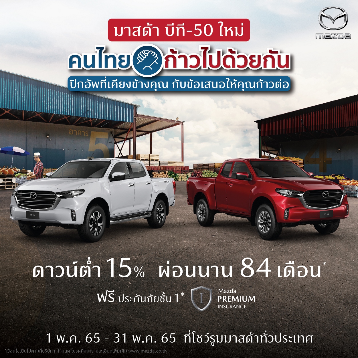 นายธีร์ ยังได้กล่าวเสริมว่า “จากสถานการณ์ความยากลำบากตลอดระยะเวลาที่ผ่านมา วันนี้สถานการณ์ต่างๆ กำลังเริ่มปรับตัวไปในทิศทางที่ดีขึ้น มาสด้าขอเป็นอีกหนึ่งพลังแรงใจในการสนับสนุนและผลักดันให้คนไทยก้าวผ่านสถานการณ์นี้ต่อไปด้วยกัน ด้วยการมอบแคมเปญพิเศษ “มาสด้า บีที-50 ใหม่ คนไทยก้าวไปด้วยกัน” ซึ่งเป็นแคมเปญเพื่อส่งเสริมให้คนไทยมีกำลังใจลุกขึ้นสู้และก้าวต่อไปด้วยกัน เพื่อเติมเต็มความสุขของครอบครัว พร้อมที่จะเดินหน้าสร้างธุรกิจและก้าวไปสู่ความสำเร็จที่ตั้งเป้าหมายไว้ ด้วยข้อเสนอ เงินดาวน์ต่ำเพียง 15% ผ่อนนานสูงสุด 84 เดือน1 ฟรีประกันภัยชั้น 1 Mazda Premium Insurance อีกด้วย ซึ่งนับเป็นแคมเปญที่ดีที่สุดที่ลูกค้าไม่ควรพลาด”
